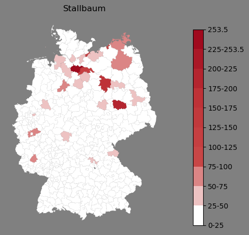 Relative Verteilung des Namens Stallbaum (1996)Direkt zur Karte Die Farbskala zeigt die Anzahl von "Stallbaum" bezogen auf je 1 Million Einträge. |