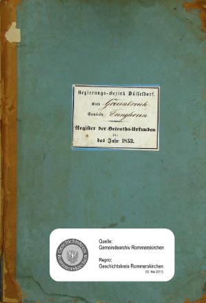 <tab head="top" class="wikitable sortable" width="1200"> Nr. Datum Name, Vorname(n) des Mannes Alter Geburtsort Beruf Name, Vorname(n) der Frau Alter Geburtsort Beruf 1 07.01.1853 Kratz, Heinrich Josef 30 Jahre Evinghoven Dienstknecht Hurtz, Anna Sophia 34 Jahre Widdeshoven ohne Gewerbe 2 04.02.1853 Weyer, Wilhelm 35 Jahre Widdeshoven Ackerknecht Rosellen, Maria Sophia 20 Jahre Oekoven Dienstmagd 3 05.02.1853 Schmitz, Adam 32 Jahre Straberg Schneider Schmitz, Maria Sibilla 33 Jahre Evinghoven Dienstmagd 4 15.04.1853 Ockenfelds, Josef 27 Jahre Leutesdorf Gärtner Pesch, Clara Anna 23 Jahre Ramrath ohne Gewerbe 5 07.05.1853 Eigen, Heinrich 34 Jahre Weckhoven Hufschmiedgeselle Pütz, Christina 28 Jahre Hüchelhoven ohne Gewerbe 6 20.05.1853 Viess, Johann 24 Jahre Wenden Knecht Komanns, Elisabeth 23 Jahre Oekoven ohne Gewerbe 7 04.06.1853 Kroell, Anton 27 Jahre Pulheim Taglöhner Kreuer, Margaretha 35 Jahre Gohr ohne Gewerbe 8 14.07.1853 Sertorius, Karl Theodor Hubert 34 Jahre Kapellen Lehrer Düppers, Maria Agnes Gertrud 24 Jahre Widdeshoven ohne Gewerbe 9 17.09.1853 Hamacher, Johann Stephan 24 Jahre Widdeshoven Taglöhner Huhn, Anna Katharina 32 Jahre Widdeshoven ohne Gewerbe 10 10.11.1853 Esser, Peter Wilhelm 24 Jahre Widdeshoven Maurer Düster, Maria Anna 22 Jahre Rommerskirchen ohne Gewerbe 11 19.11.1853 von Kaster, Anton 26 Jahre Ramrath Schuster Reuter, Anna Maria 28 Jahre Ramrath Kleinhändlerin 12 22.11.1853 Oepen, Ludwig 31 Jahre Widdeshoven Schreiner Hesch, Elisabeth 31 Jahre Widdeshoven ohne Gewerbe </tab>