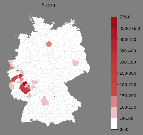 Relative Verteilung des Namens Steeg (1996)Direkt zur Karte Die Farbskala zeigt die Anzahl von "Steeg" bezogen auf je 1 Million Einträge. |