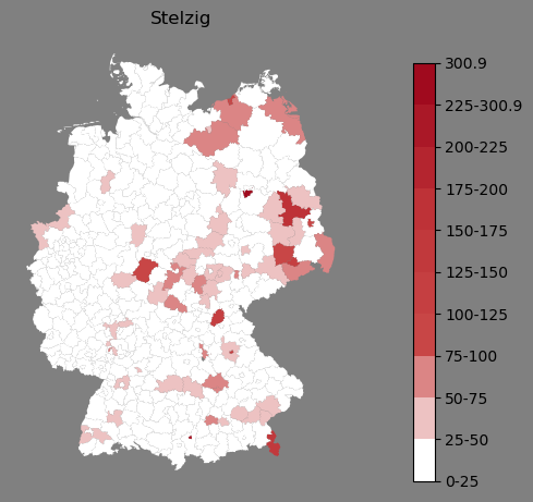 Relative Verteilung des Namens Stelzig (1996)Direkt zur Karte Die Farbskala zeigt die Anzahl von "Stelzig" bezogen auf je 1 Million Einträge. |