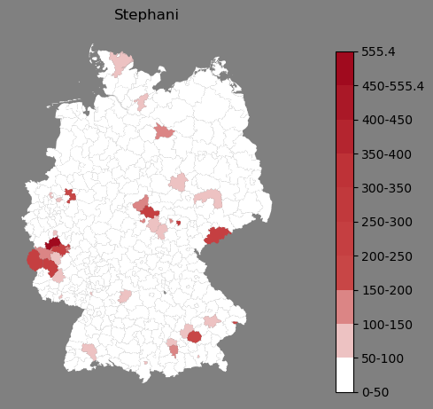 Relative Verteilung des Namens Stephani (1996)Direkt zur Karte Die Farbskala zeigt die Anzahl von "Stephani" bezogen auf je 1 Million Einträge. |