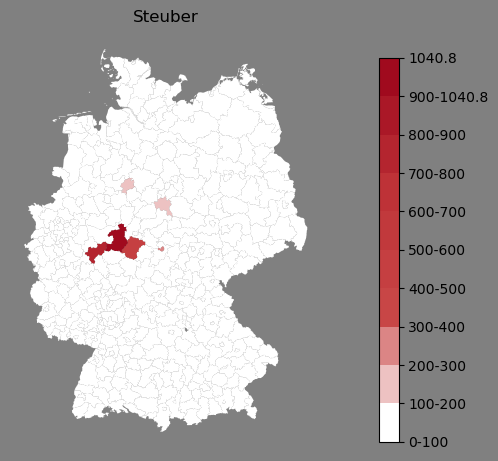 Relative Verteilung des Namens Steuber (1996)Direkt zur Karte Die Farbskala zeigt die Anzahl von "Steuber" bezogen auf je 1 Million Einträge. |