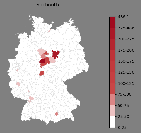 Relative Verteilung des Namens Stichnoth (1996)Direkt zur Karte Die Farbskala zeigt die Anzahl von "Stichnoth" bezogen auf je 1 Million Einträge. |