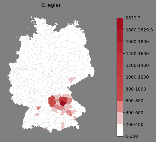 Relative Verteilung des Namens Stiegler (1996)Direkt zur Karte Die Farbskala zeigt die Anzahl von "Stiegler" bezogen auf je 1 Million Einträge. |