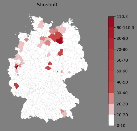 Relative Verteilung des Namens Stinshoff (1996)Direkt zur Karte Die Farbskala zeigt die Anzahl von "Stinshoff" bezogen auf je 1 Million Einträge. |