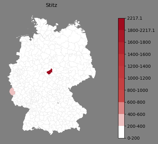 Relative Verteilung des Namens Stitz (1996)Direkt zur Karte Die Farbskala zeigt die Anzahl von "Stitz" bezogen auf je 1 Million Einträge. |