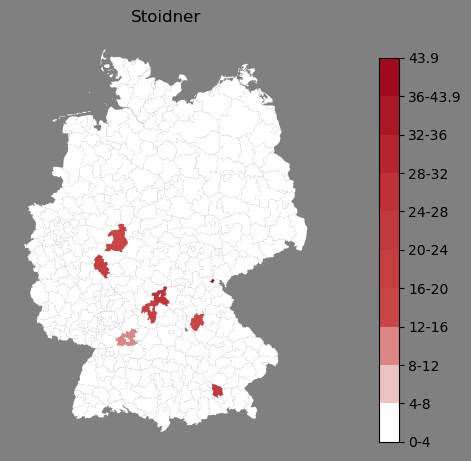 Relative Verteilung des Namens Stoidner (1996)Direkt zur Karte Die Farbskala zeigt die Anzahl von "Stoidner" bezogen auf je 1 Million Einträge. |
