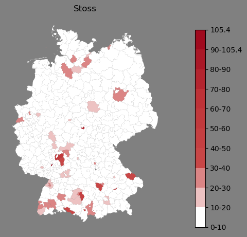 Relative Verteilung des Namens Stoss (1996)Direkt zur Karte Die Farbskala zeigt die Anzahl von "Stoss" bezogen auf je 1 Million Einträge. |