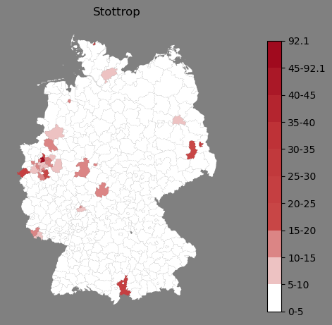 Relative Verteilung des Namens Stottrop (1996)Direkt zur Karte Die Farbskala zeigt die Anzahl von "Stottrop" bezogen auf je 1 Million Einträge. |