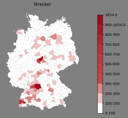 Relative Verteilung des Namens Strecker (1996)Direkt zur Karte Die Farbskala zeigt die Anzahl von "Strecker" bezogen auf je 1 Million Einträge. |