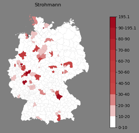 Relative Verteilung des Namens Strohmann (1996)Direkt zur Karte Die Farbskala zeigt die Anzahl von "Strohmann" bezogen auf je 1 Million Einträge. |