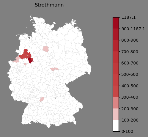 Absolute Verteilung des Namens Strothmann (1890)Direkt zur Karte Absolute Verteilung des Namens "Strothmann" um 1890 im damaligen Deutschen Reich Sie können die Karte innerhalb des Fensters zoomen und verschieben. |