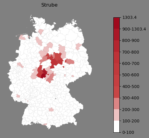 Relative Verteilung des Namens Strube (1996)Direkt zur Karte Die Farbskala zeigt die Anzahl von "Strube" bezogen auf je 1 Million Einträge. |