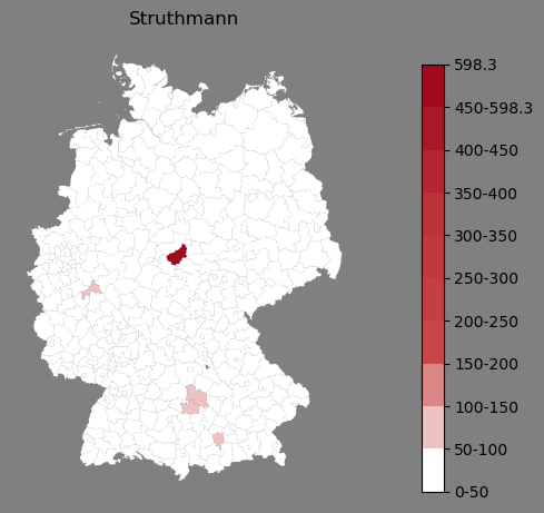 Relative Verteilung des Namens Struthmann (1996)Direkt zur Karte Die Farbskala zeigt die Anzahl von "Struthmann" bezogen auf je 1 Million Einträge. |