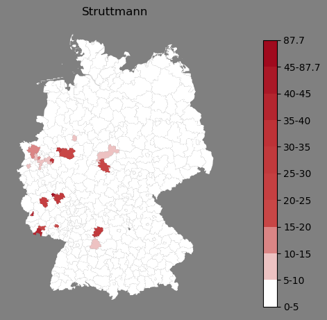Relative Verteilung des Namens Struttmann (1996)Direkt zur Karte Die Farbskala zeigt die Anzahl von "Struttmann" bezogen auf je 1 Million Einträge. |