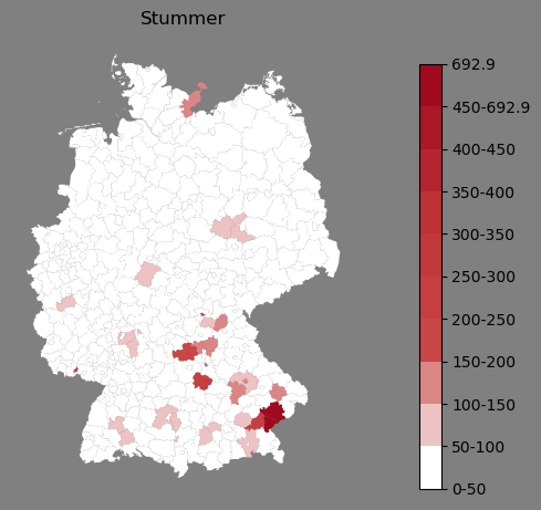 Relative Verteilung des Namens Stummer (1996)Direkt zur Karte Die Farbskala zeigt die Anzahl von "Stummer" bezogen auf je 1 Million Einträge. |