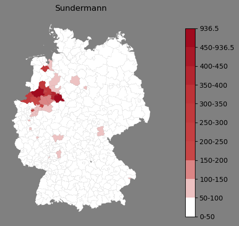 Absolute Verteilung des Namens Sundermann (1890)Direkt zur Karte Absolute Verteilung des Namens "Sundermann" um 1890 im damaligen Deutschen Reich Sie können die Karte innerhalb des Fensters zoomen und verschieben. |