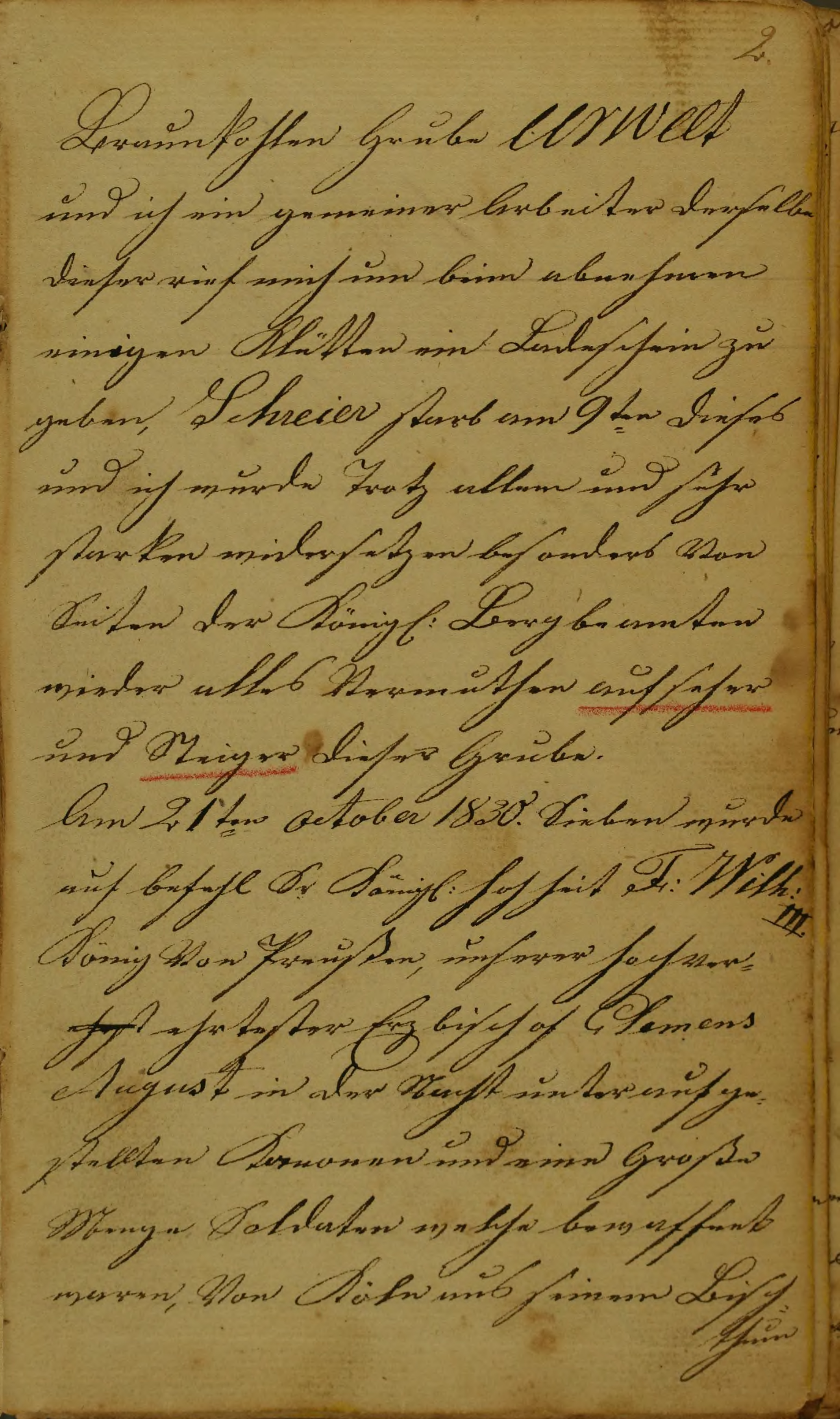 Am 21ten October 1830.Sieben wurde auf Befehl Sr Königl: Hohheit Fr: Wilh: III. König Von Preußen, unserer Hochverehrtester Erzbischof Clemens August in der Nacht unter aufgestellten Kanonen und eine Große Menge Soldaten welche bewaffnet waren, Von Köln aus seinem Bischthum
