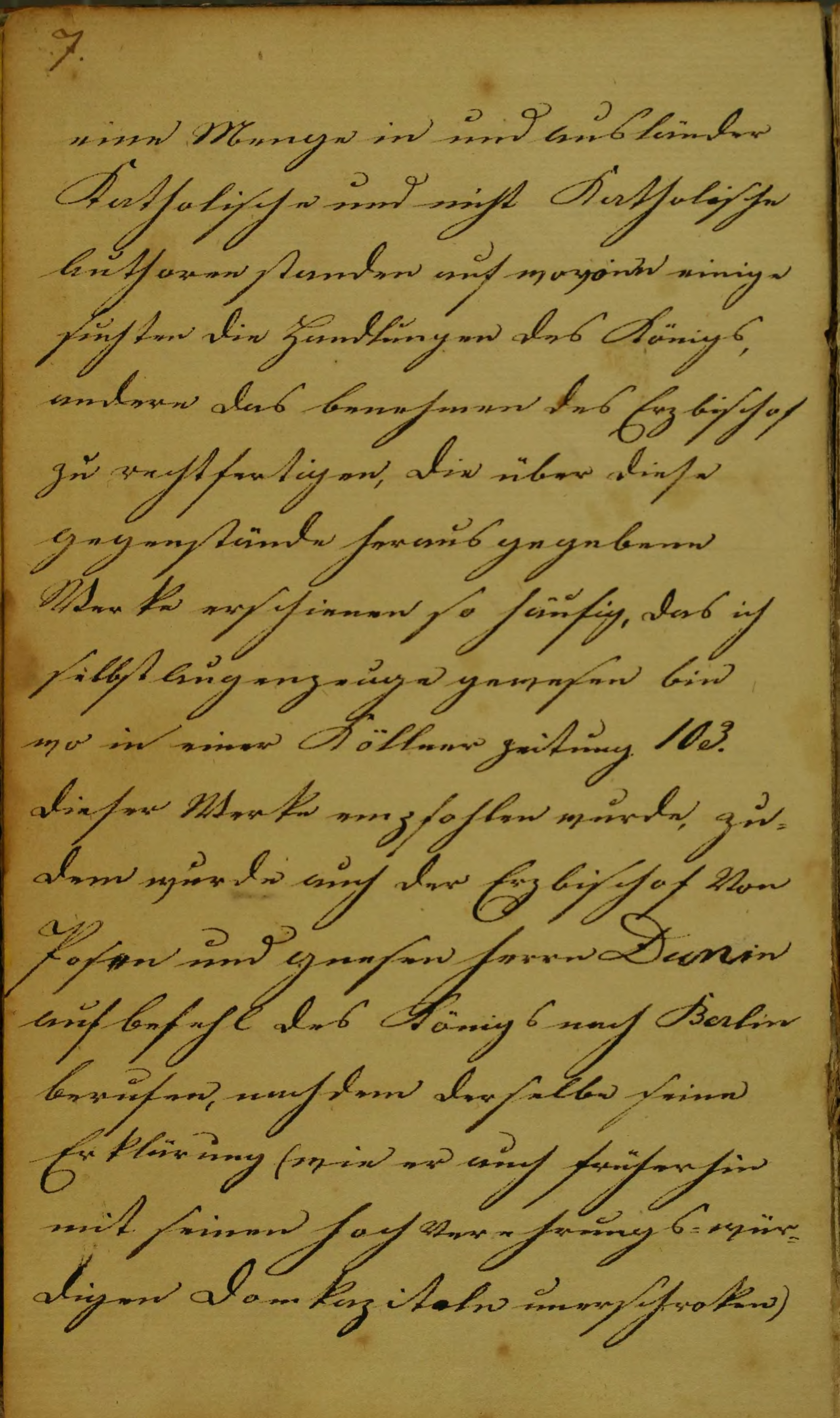 eine Menge in und ausländer Katholische und nicht Katholische Authoren standen auf wovonn einige suchten die Handlungen des Königs, andere das benehmen des Erzbischof zu rechtfertigen, die über diese gegenstände herausgegebene Werke erschienen so häufig, das ich selbst Augenzeuge gewesen bin wo in einer Köllner zeitung 103. dieser Werke empfohlen wurde, zudem wurde auch der Erzbischof von Posen und gnesen herrn Dunin auf befehl des Königs nach Berlin berufen, nachdem derselbe seine Erklärung (wie er auch früherhin mit seinen hochverehrungs-würdigen domkapiteln unerschroken)