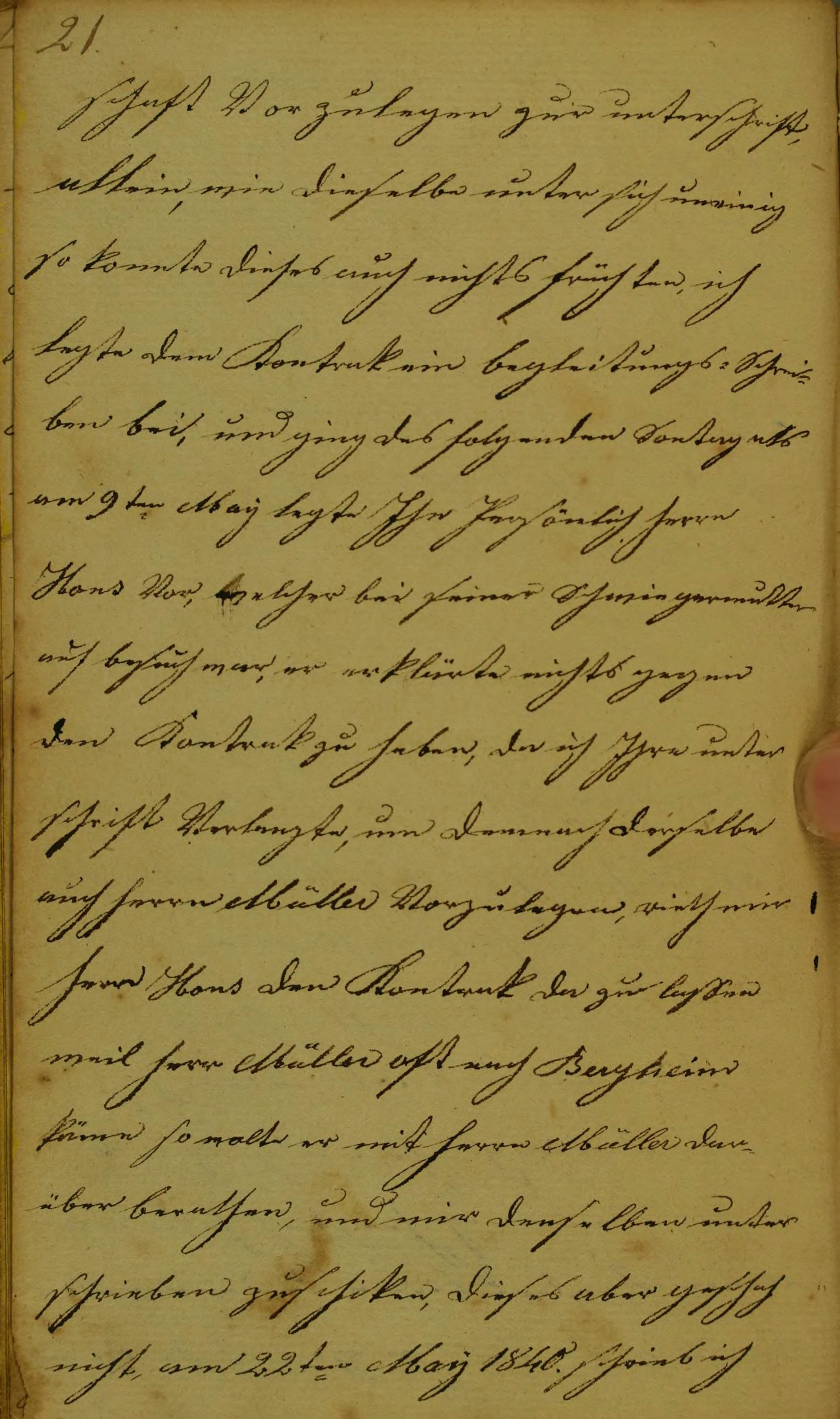 Vorzulegen zur unterschrift, allein, wie dieselbe unter sich uneinig so konnte dieses auch nichts früchten, ich legte den Kontrak ein begleitungs-Schreiben bei, und ging des folgenden Sontag als am 9ten May legte Ihn Persönlich herrn Hons Vor, welcher bei seiner Schwiegermutter auf besuch war, er erklärte nichts gegen den Kontrak zu haben, da ich Ihre unterschrift Verlangte, um demnach derselbe auch herrn Müller Vorzulegen, rieth mir herrn Hons den Kontrak da zu lassen weil herr Müller oft nach Bergheim käme so wolte er mit herrn Müller darüber berathen, und mir denselben unterschrieben zuschiken, dieses aber geschah nicht, am 22ten May 1840 schrieb ich