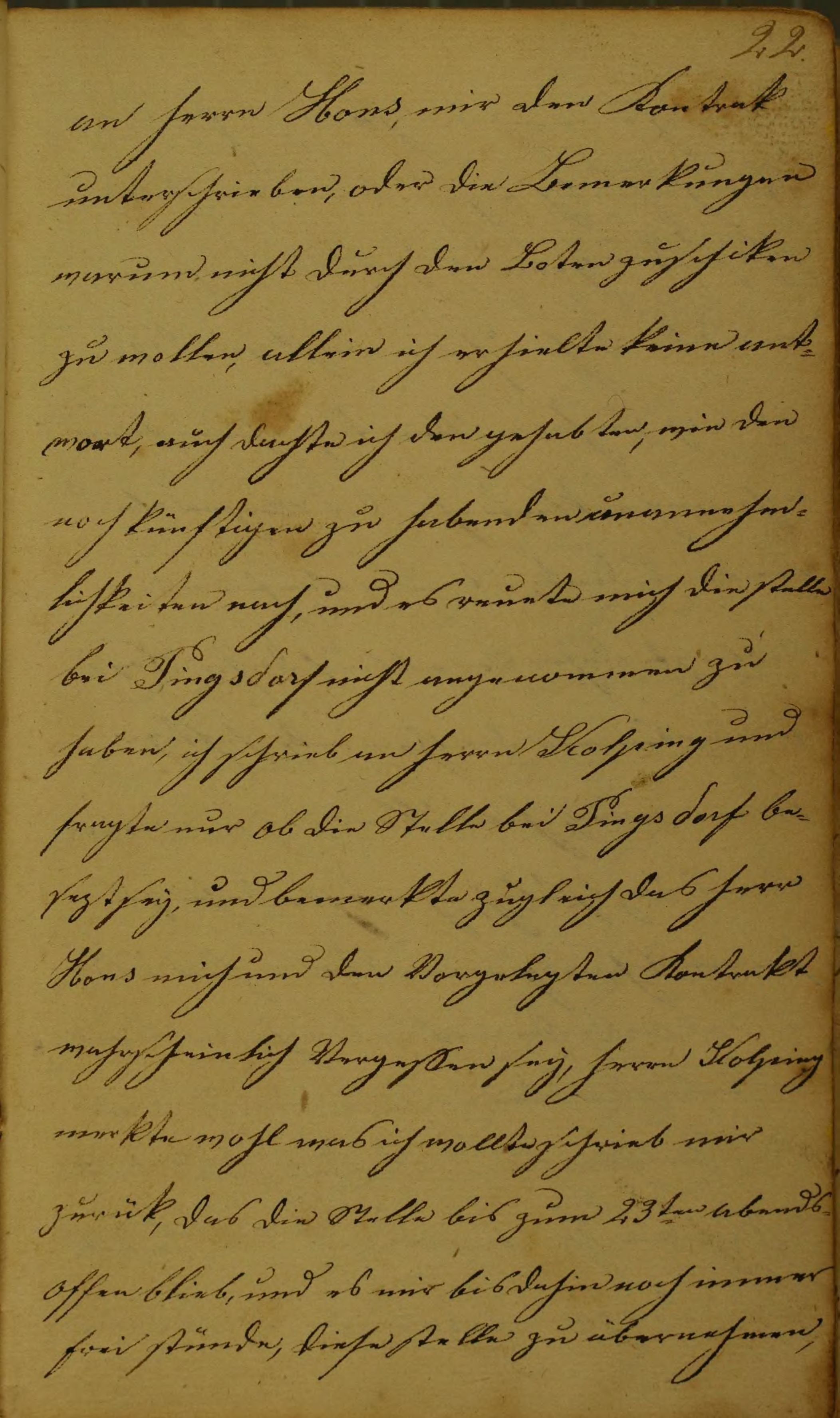 an herrn Hons, mir den Kontrak unterschrieben, oder die Bemerkungen warum nicht durch den Boten zuschiken zu wollen, allein ich erhielte keine antwort, auch dachte ich den gehabten, wie den noch künftigen zu habenden unannehmlichkeiten nach, und es reuete mich die stelle bei Pingsdorf nicht angenommen zu haben, ich schrieb an herrn Kolping und fragte nur ob die Stelle bei Pingsdorf besezt sey, und bemerkte zugleich das herr Hons mich und den Vorgelegten Kontrakt wahrscheinlich Vergessen sey, herrn Kolping merkte wohl was ich wollte schrieb mir zurük, das die Stelle bis zum 23ten abends offen blieb, und es mir bis dahin noch immer frei stünde, diese Stelle zu übernehmen,