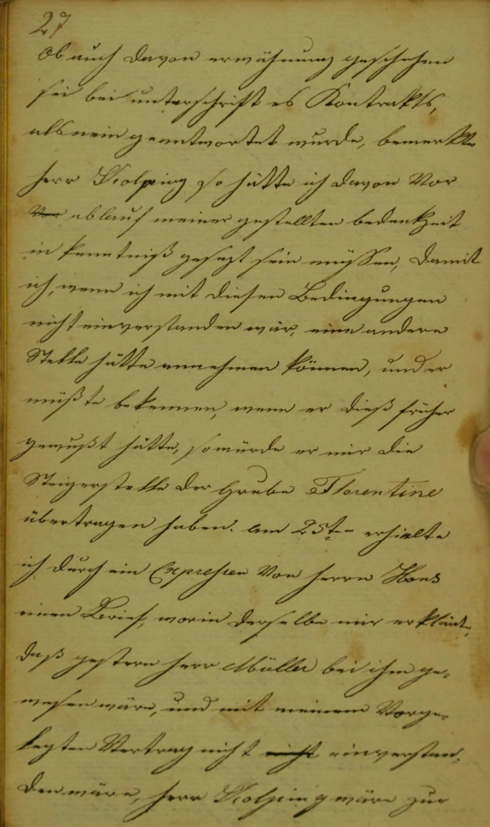 Ob auch davon erwähnung geschehen sei bei unterschrift es Kontrakts, als nein geantwortet wurde, bemerkte herr Kolping so hätte ich davon Vor Vor ablauf meiner gestellten bedenkzeit in kenntniß gesezt sein müssen, damit ich, wenn ich mit diesen Bedingungen nicht einverstanden wär, eine andere Stelle hätte annehmen können, und er müßte bekennen, wenn er dieß früher gewußt hätte, so würde er mir die Steigerstelle der Grube Florentine übertragen haben, am 25ten erhielte ich durch ein Expressen Von herrn Hons einen Brief, worin derselbe mir erklärte, daß gestern herr Müller bei ihm gewesen wäre, und mit meinem Vorgelegten Vertrag nicht nicht einverstanden wäre, herr Kolping wäre zur