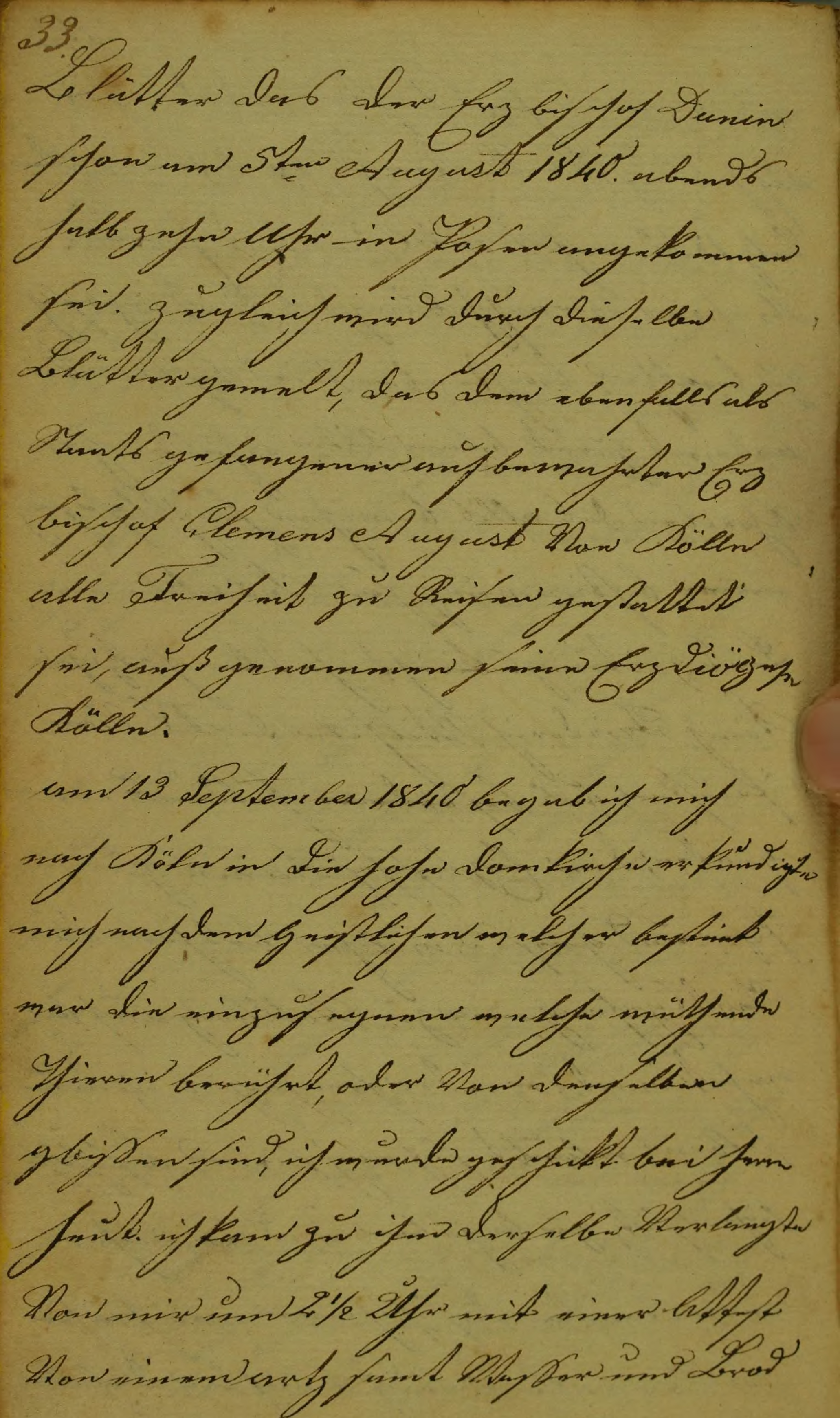 am 13 September 1840 begab ich mich nach Köln in die hohe Domkirche erkundigte mich nach dem Geistlichen welcher bestimt war die einzusegnen welche wüthende Thieren berührt, oder Von denselben gbissen sind, ich wurde geschickt bei herrn heut. ich kam zu ihm derselbe Verlangte Von mir um 2 1/2 Uhr mit einer Attest Von einem artz samt Wasser und Brod