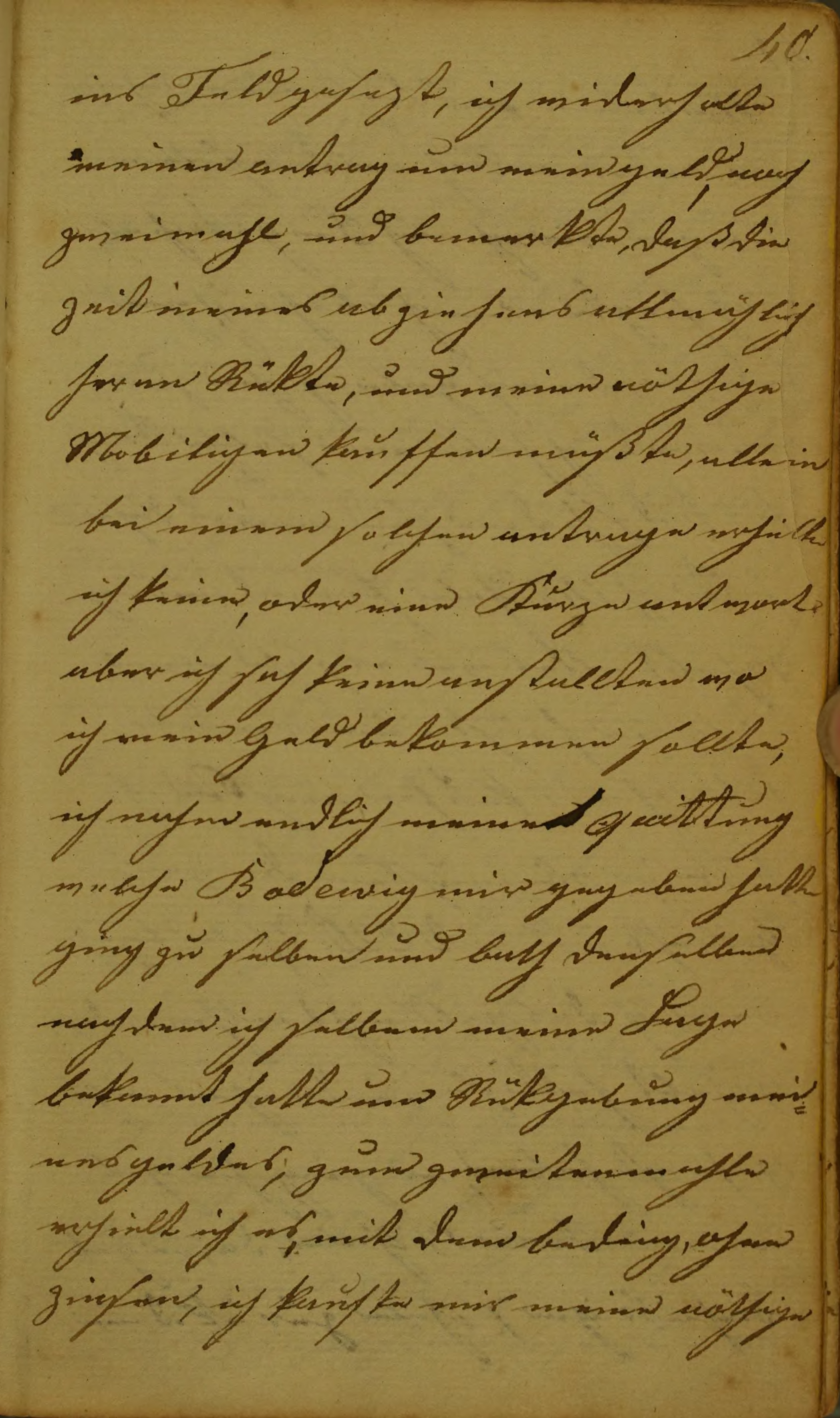 ins Feld gesezt, ich widerholte meinen antrag um mein geld, noch zweimahl, und bemerkte, daß die Zeit meines abziehens allmählich heran Rükte, und meine nöthige Mobiligen kauffen müßte, allein bei einem solchen antrage erhielte ich keine, oder eine Kurze antwort aber ich sah keine anstallten wo ich mein Geld bekommen sollte, ich nahm endlich meine Quittung welche Bodewig mir gegeben hatte ging zu selben und bath denselben nachdem ich selbem meine Lage bekannt hatte um Rükgebung meines Geldes, zum zweitenmahle erhielt ich es, mit dem beding, ohne Zinsen, ich kaufte mir meine nöthige