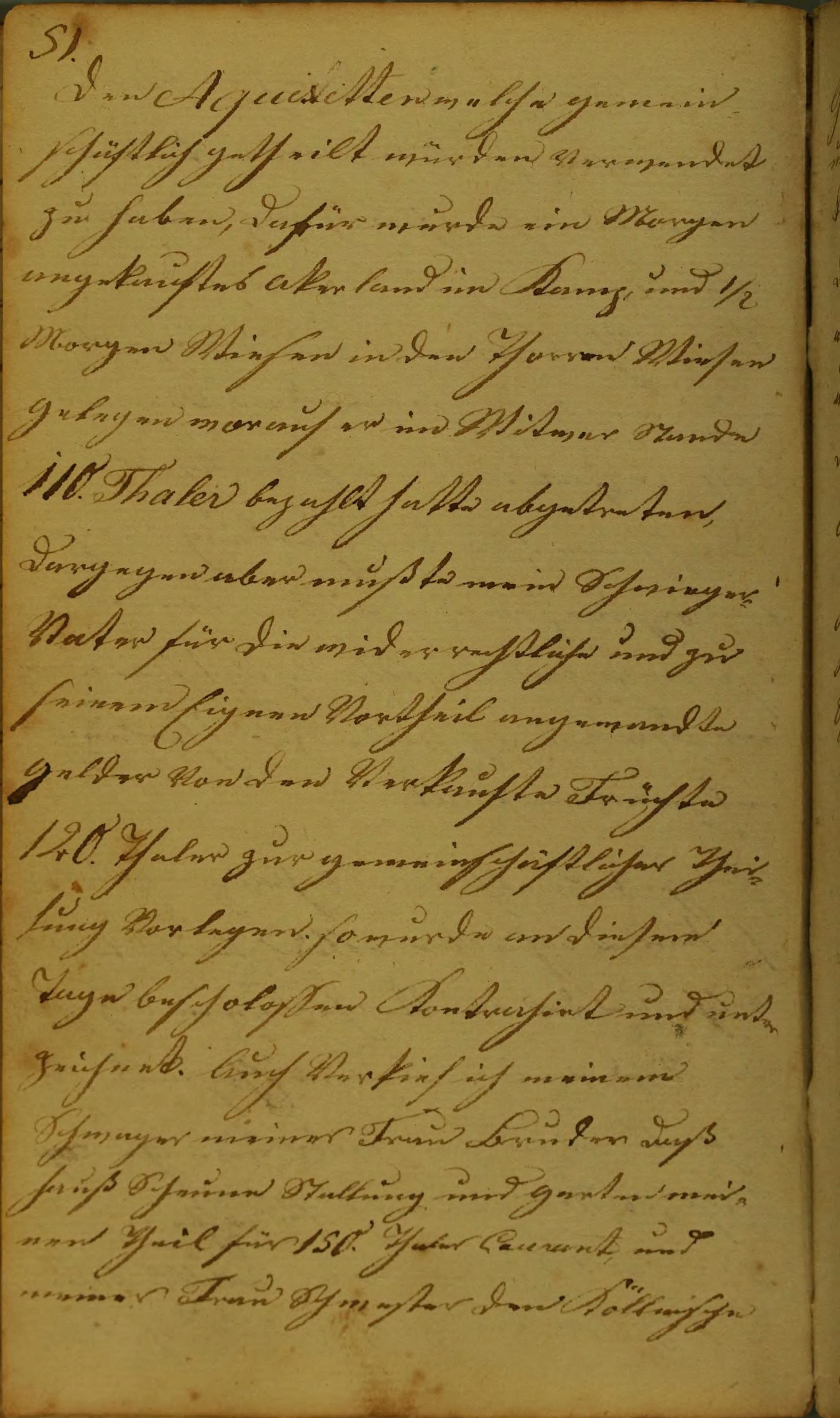 den Aquisitten welche gemeinschäftlich getheilt würden Verwendet zu haben, dafür wurde ein Morgen angekauftes Akerland im Kamp, und 1/2 Morgen Wiesen in den Thorren Wiesen gelegen worauf er im Witwer Stande 110. Thaler bezahlt hatte abgetreten, dargegen aber mußte mein Schwiegervater für die widerrechtliche und zu seinem Eignen Vortheil angewandte Gelder Von den Verkaufte Früchte 120. Thaler zur gemeinschäftlicher Theilung Vorlegen. so wurde an diesem Tage beschlossen[1] Kontrahirt und unterzeichnet. Auch verkief ich meinem Schwager meiner Frau Bruder daß hauß Scheune Stallung und garten meinen Theil für 150. Thaler Courant, und meiner Frau Schwester den Köllnische (Garten)