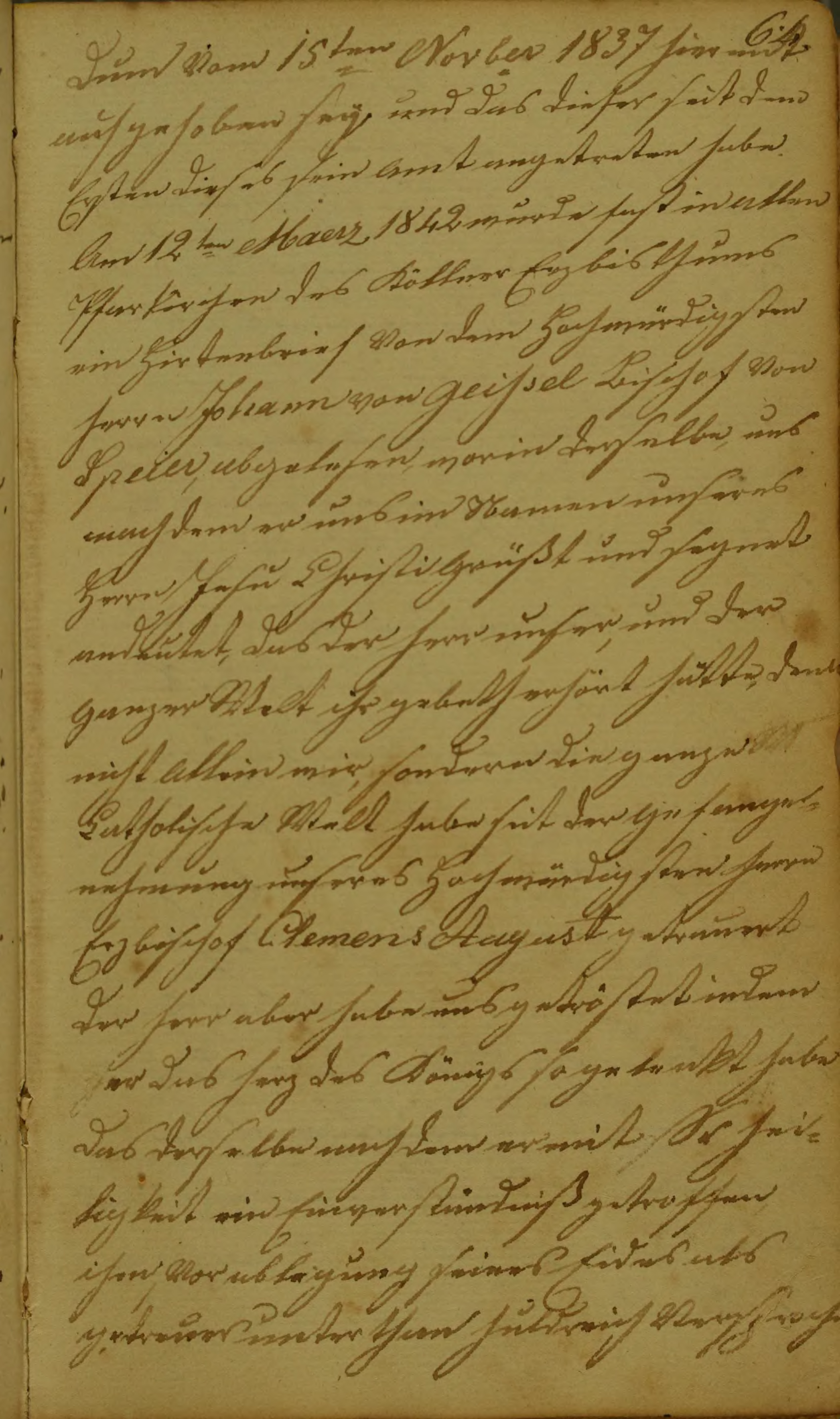 Am 12ten Maerz 1842 wurde fast in allen Pfarkirchen des Köllner Erzbisthums ein Hirtenbrief Von dem Hochwürdigsten herrn Johann Von Geissel Bischof Von Speier, abgelesen, worin derselbe, uns nachem er uns im Namen unseres Herrn Jesu Christi Grüßt und segnet andeutet, das der herr unser, und der Ganzer Welt ihr gebeth erhört hätte, denn nicht allein wir, sondern die ganze Catholische Welt habe seit der Gefangenehmung unseres Hochwürdigsten herrn Erzbischof Clemens August getrauert