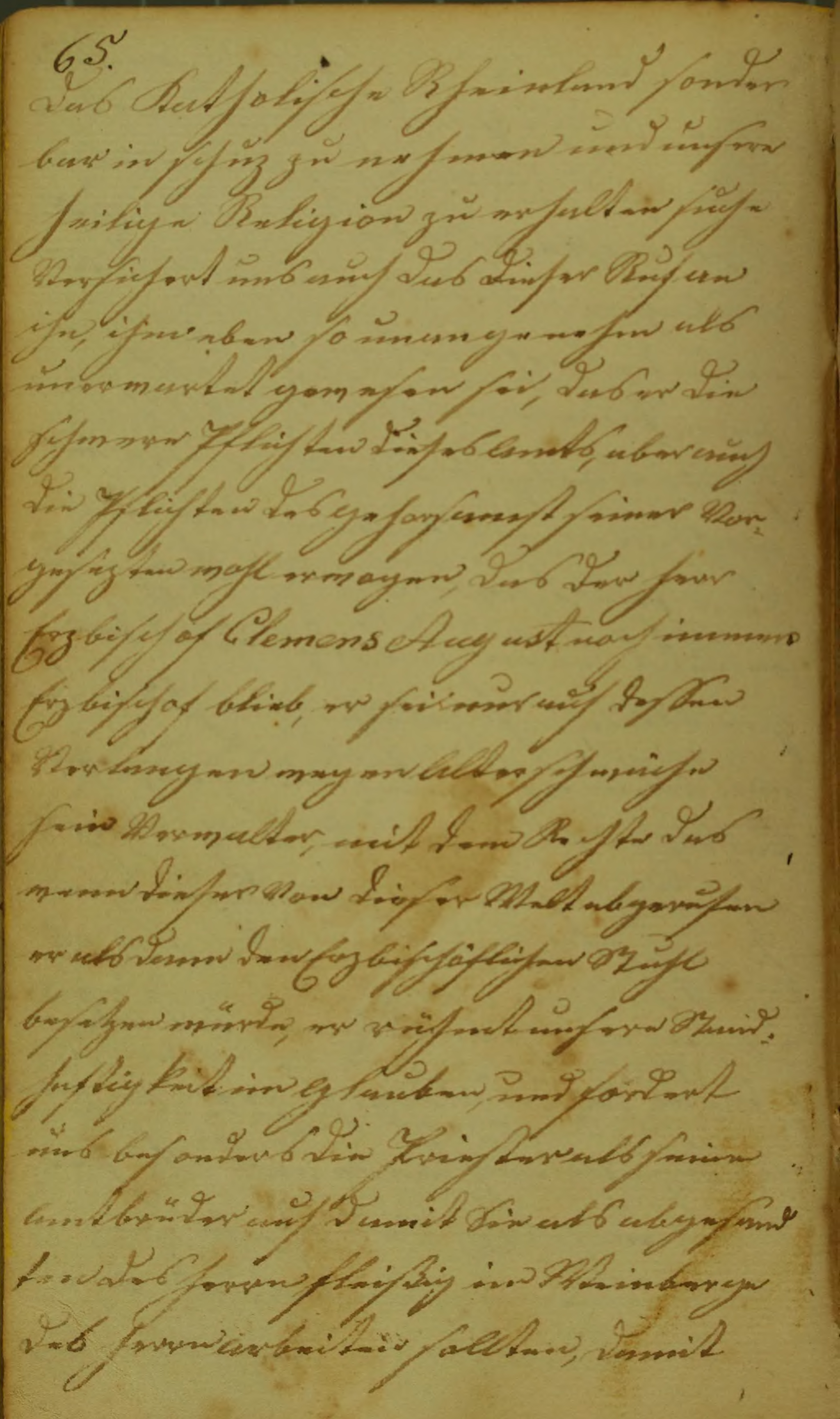das Katholische Rheinland sonderbar in Schuz zu nehmen und unsere heilige Religion zu erhalten suche Versichert uns auf das dieser Ruf an ihn, ihm eben so unangenehm als unerwartet gewesen sei, das er die schwere Pflichten dieses Amts, aber auch die Pflichten des gehorsamst seiner Vorgesezten wohl erwogen, das der herr Erzbischof Clemens August noch immer Erzbischof blieb, er sei nur auf dessen Verlangen wegen Alterschwäche sein Verwalter, mit dem Rechte das wenn dieser von dieser Welt abgerufen er alsdann den Erzbischöflichen Stuhl besetzen würde, er rühmt unsere Standhaftigkeit im Glauben, und fordert uns besonders die Priester als seine Amtbrüder auf damit Sie als abgesandten des Herrn fleißig im Weinberge des Herrn arbeiten sollten, damit