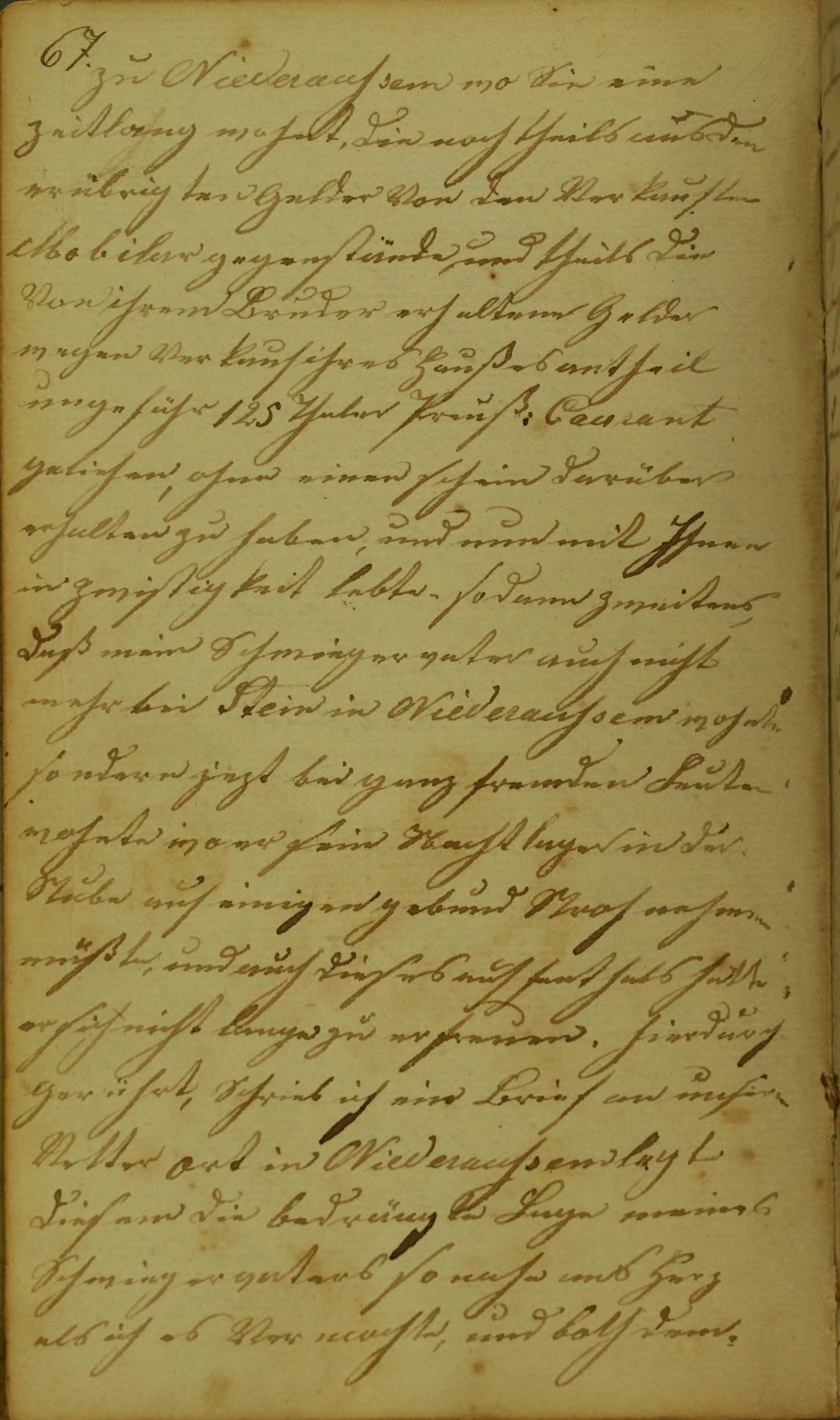 Niederaussem wo Sie eine zeitlang wohnt, die noch theils aus den erübrigten Gelder Von den Verkauften Mobilar gegenstände und theils die Von ihrem Bruder erhaltene Gelder wegen Verkauf ihres Haußes antheil ungefähr 125 Thaler Preuß: Caurant geliehen, ohne einen schein darüber erhalten zu haben, und nun mit Ihnen in Zwistigkeit lebte. sodann zweitens, daß mein Schwiegervater auch nicht mehr bei Stein in Niederaussem wohnte sondern jezt bei ganz fremden Leuten wohnte wo er sein Nachtlager in der Stube auf einigen gebund Stroh nehmen müßte, und auch dieses auffenthals hätte er sich nicht lange zu erfreuen. hierdurch gerührt, Schrieb ich ein Brief an unseren Vetter ort in Niederaussem legte diesem die bedrängte Lage meines Schwiegervaters so nahe ans Herz als ich es Vermochte, und both demselben