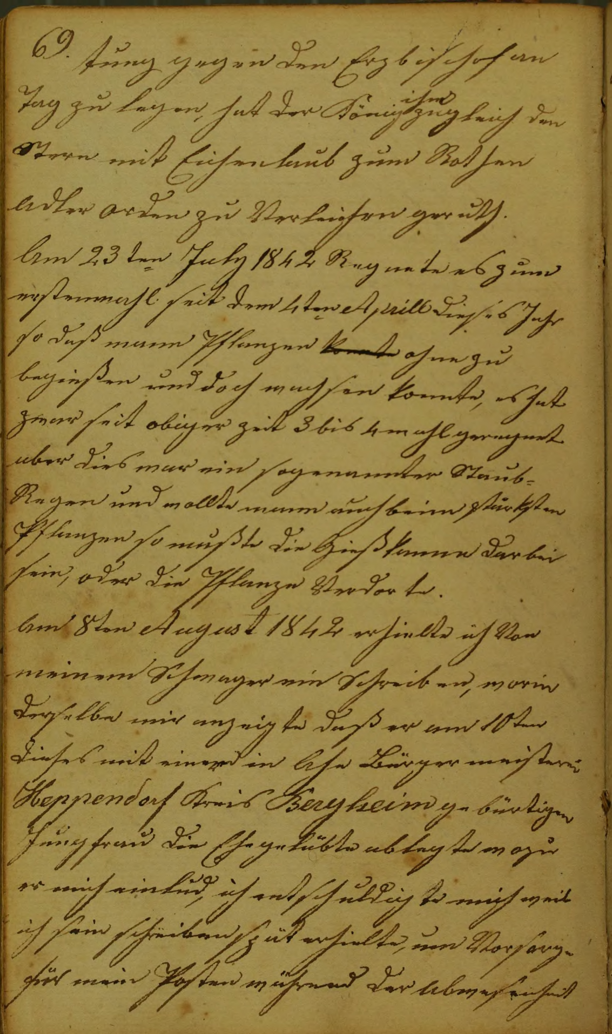 Am 8ten August 1842 erhiellte ich Von meinem Schwager ein Schreiben, worin derselbe mir enzeigte daß er am 10ten dieses mit einer in Ahe Bürgermeisterei Heppendorf Kreis Bergheim gebürtigen Jungfrau die Ehegelübte ablegte wozu er mich einlud, ich entschuldigte mich weil ich sein schreiben spät erhielte, um Vorsorge für mein Posten während der abwesenheit