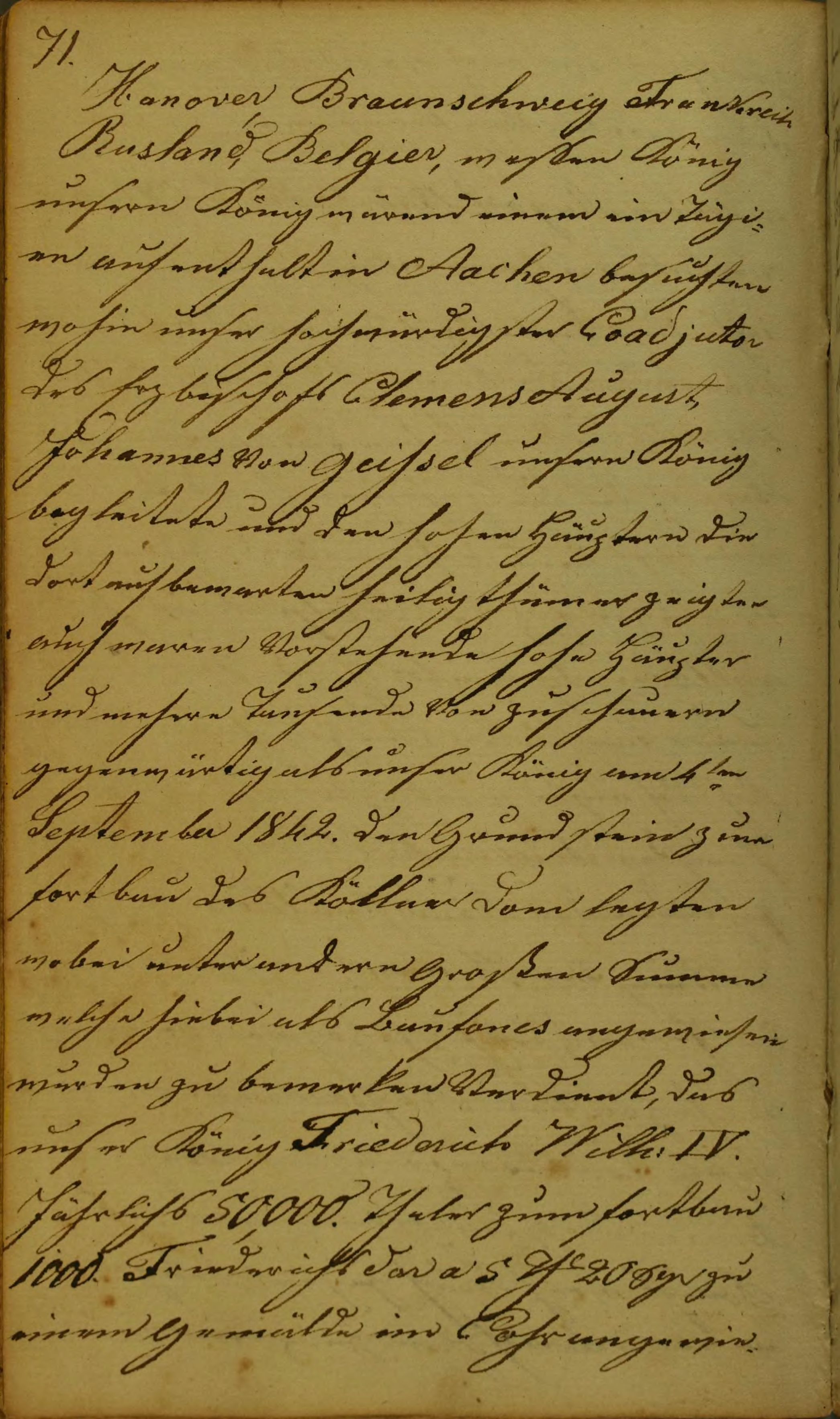 Hanover Braunschweig Frankreich Rusland, Belgier wessen König unsern König wärend einem ein Tägien aufenthalt in Aachen besuchten wohin unser hochwürdigster Coadjutor des Erzbischofs Clemens August, Johannes Von Geissel unsern König begleitete und den hohen Häuptern die dort aufbewarten heiligthümer zeigten auch waren Vorstehende hohe Häupter und mehern Tausende Von zuschauern gegenwärtig als unser König am 4ten September 1842. den Grundstein zum fortbau des Köllner Dom legten wobei unter andern Großen Summe welche hiebei als Baufones angewiesen wurden zu bemerken Verdient, das unser König Friederich Wilh: IV. Jährlichs 50,000. Thaler zum Fortbau 1000. Friederichs dor a 5 Th 20 Sgr zu einem Gemälde im Cohr angwiesen