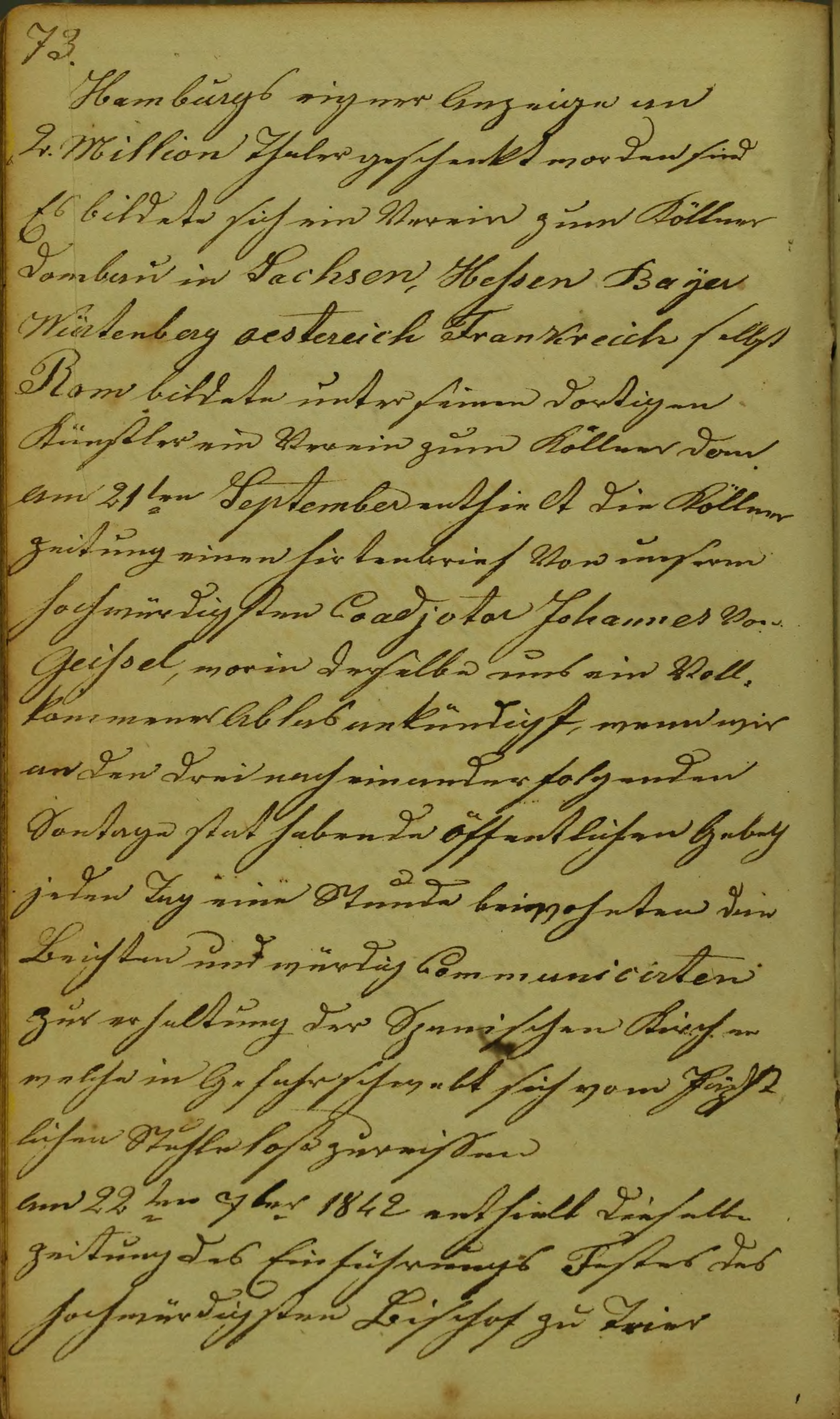 Am 21ten September enthielt die Köllner Zeitung einen hirtenbrief Von unserm hochwürdigsten Coadjotor Johannes Von Geissel, worin derselbe uns ein Vollkommener Ablas ankündigt, wenn wir an den drei nacheinanderfolgenden Sontage stat habende Öffentlichen Gebeth jeden Tag eine Stunde beiwohnten dan Beichten und würdig Communicirten zur erhaltung der Spanischen Kirchen welche in Gefahr schwebt sich vom Päpstlichen Stuhle loßzureissen.