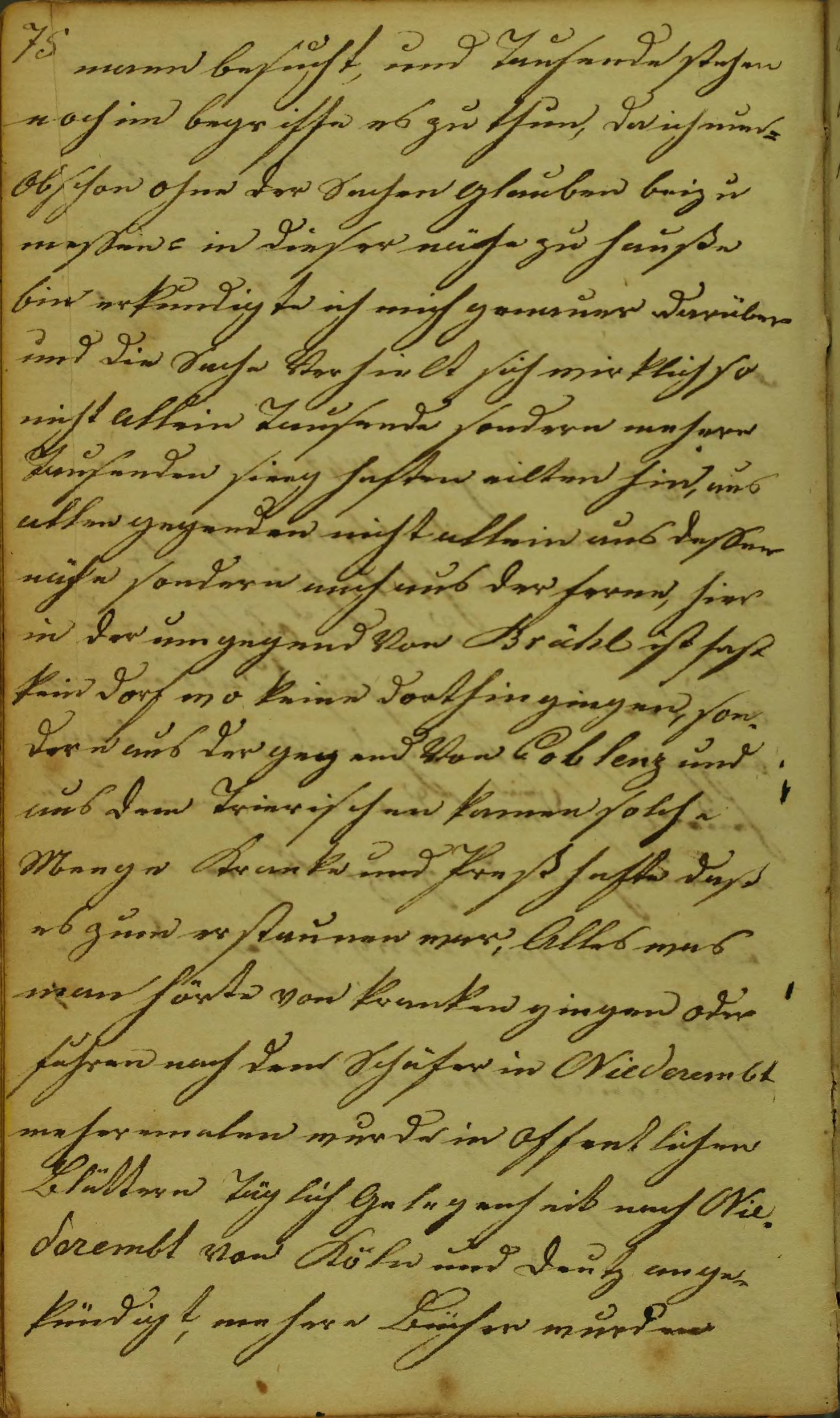besucht, und Tausende stehen noch im begriffe es zu thun, da ich nun - Obschon ohne der Sachen Glauben beizumessen - in dieser nähe zu hauße bin erkundigte ich mich genauer darüber und die Sache Verhielt sich wirklich so nicht allein Tausende sondern mehere Tausenden sienghaften (?) eilten hin, aus allen gegenden nicht allein aus dessen nähe, sondern auch aus der ferne, hier in der umgegend Von Brühl ist fast kein Dorf wo keine dorthin gingen, sondern aus der gegend Von Coblenz und aus dem Trierischen komen solche Menge Kranke und Preßhafte daß es zum erstaunen war, Alles was man hörte von Kranken gingen oder fuhren nach dem Schäfer in Niederembt meheremalen wurde in offentlichen Blättern Täglich Gelegenheit nach Niederembt Von Köln und Deutz angekündigt, mehere Bücher wurden