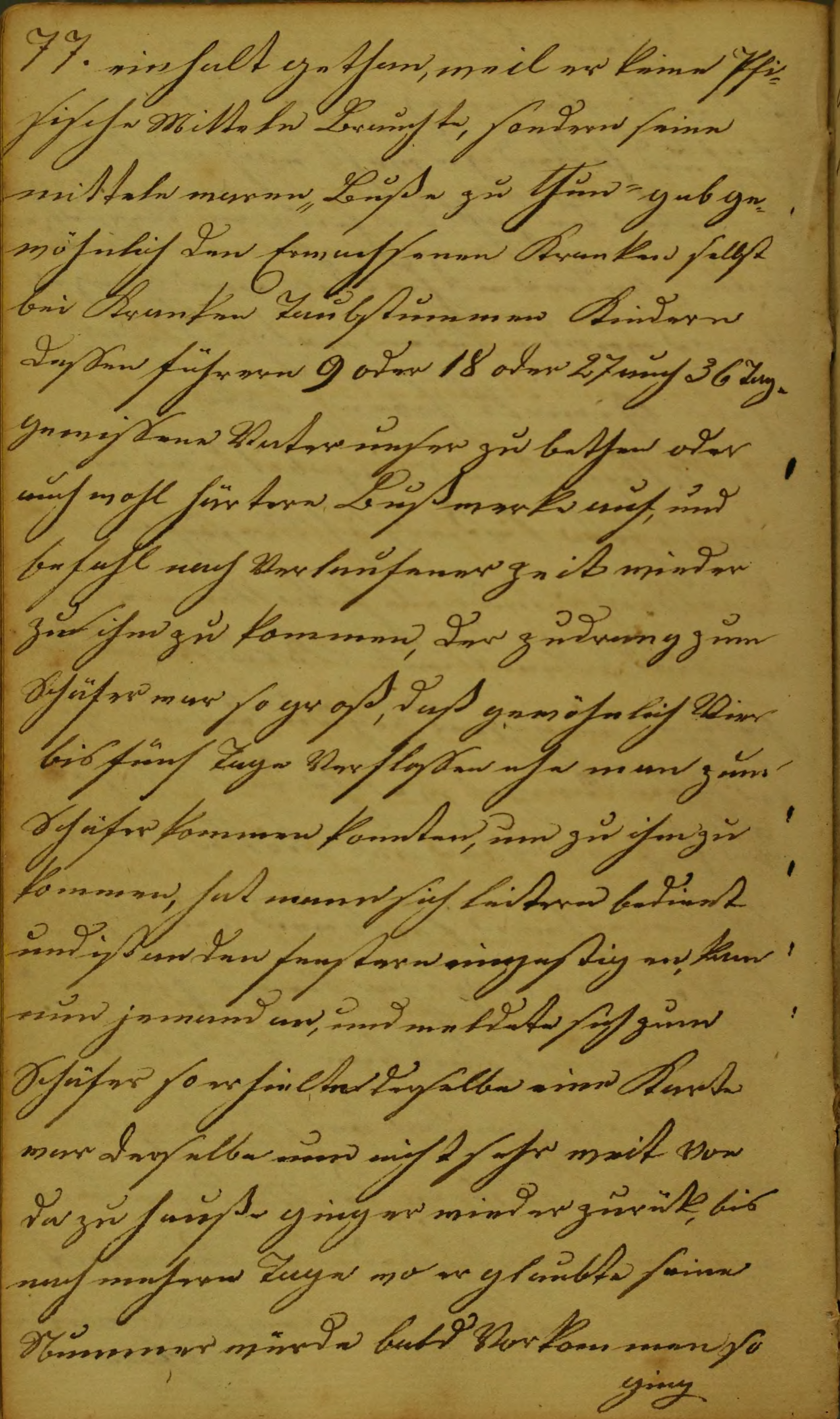 einhalt gethan, weil er keine Phisische Mitteln Brauchte, sondern seine mitteln waren „Buße zu thun“ gab gewöhnlich den Erwachsenen Kranken selbst bei Kranken Taubstummen Kindern dessen führern 9 oder 18 oder 27 auch 36 Tag. gewissene Vaterunser zu bethen oder auch wohl härtern Bußwerke auf, und befahl nach Verlaufener Zeit wieder zu ihm zu kommen, der zudrang zum Schäfer war so groß, daß gewöhnlich Vier bis fünf Tage Verflossen ehe man zum Schäfer kommen konnten, um zu ihm zu kommen, hat mann sich leitern bedient und ist an den fenstern eingestigen, kam nun jemand an, und meldete sich zum Schäfer so erhielte derselbe eine Karte war derselbe nun nicht sehr weit von da zu hauße ging er wieder zurük, bis nach mehern Tage wo er glaubte seine Nummer würde bald Vorkommen so ging