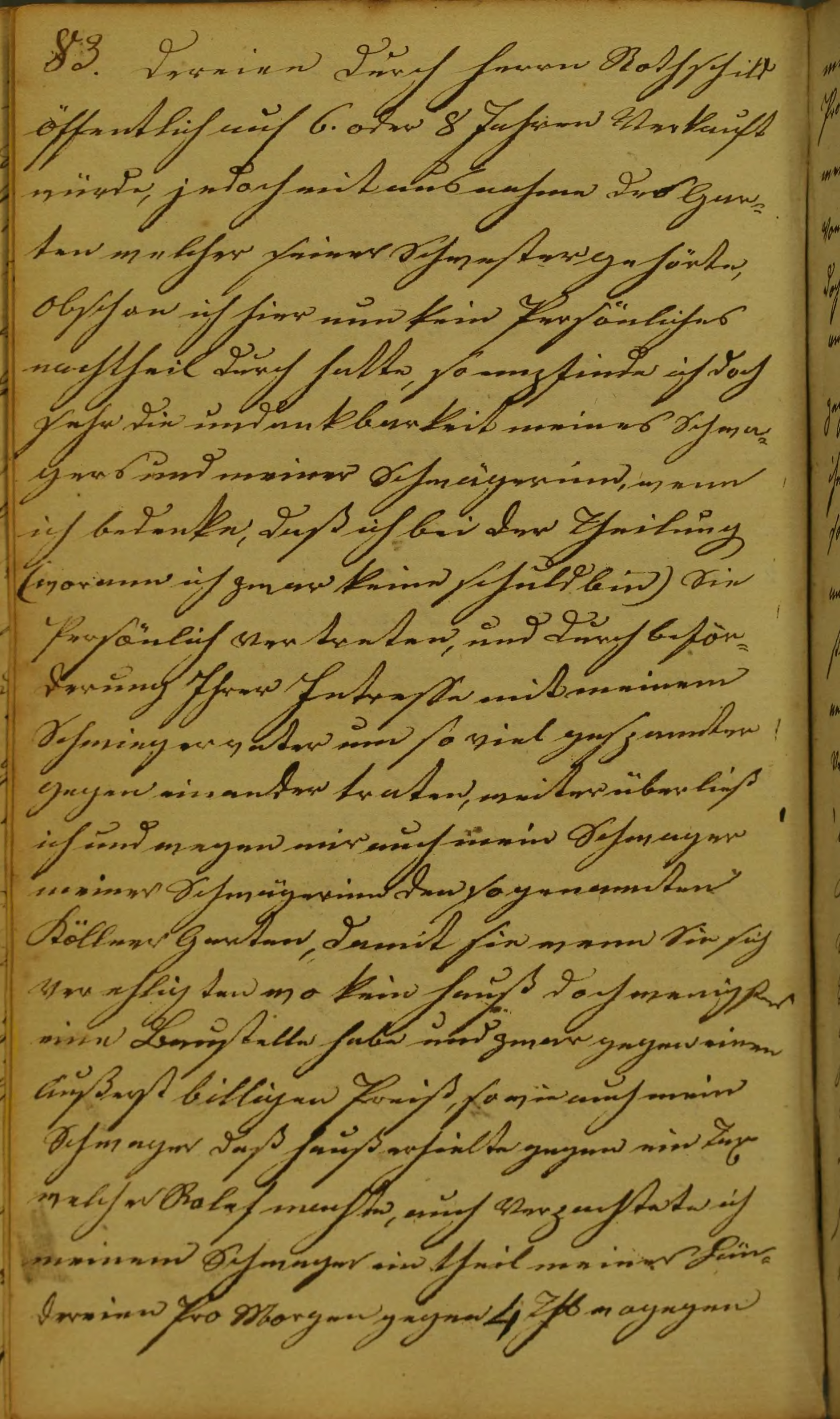 durch herrn Rothschild öffentlich auf 6. oder 8 Jahren Verkauft würde, jedoch mit ausnahme des Garten welcher seiner Schwester gehörte, Obschon ich hier nun kein Persönliches nachtheil durch hatte, so empfinde ich doch sehr die undankbarkeit meines Schwagers und meiner Schwägerinn, wenn ich bedenke, daß ich bei der Theilung (worann ich zwar keine Schuld bin) Sie Persönlich vertreten, und durch beförderung Ihrer Interesse mit meinem Schwiegervater um so viel gespannter gegen einander traten, weiter überließ ich und wegen mir auch mein Schwager meiner Schwägerinn den sogenannten Köllner Garten, damit sie wenn Sie sich Verehligten wo kein hauß doch wenigstens eine Baustelle habe und zwar gegen einen äußerst billigen Preiß, so wie auch mein Schwager daß hauß erhielte gegen ein Tax welcher Rolef machte, auch Verpachtete ich meinem Schwager ein theil meiner Ländereien Pro Morgen gegen 4 Thl wogegen