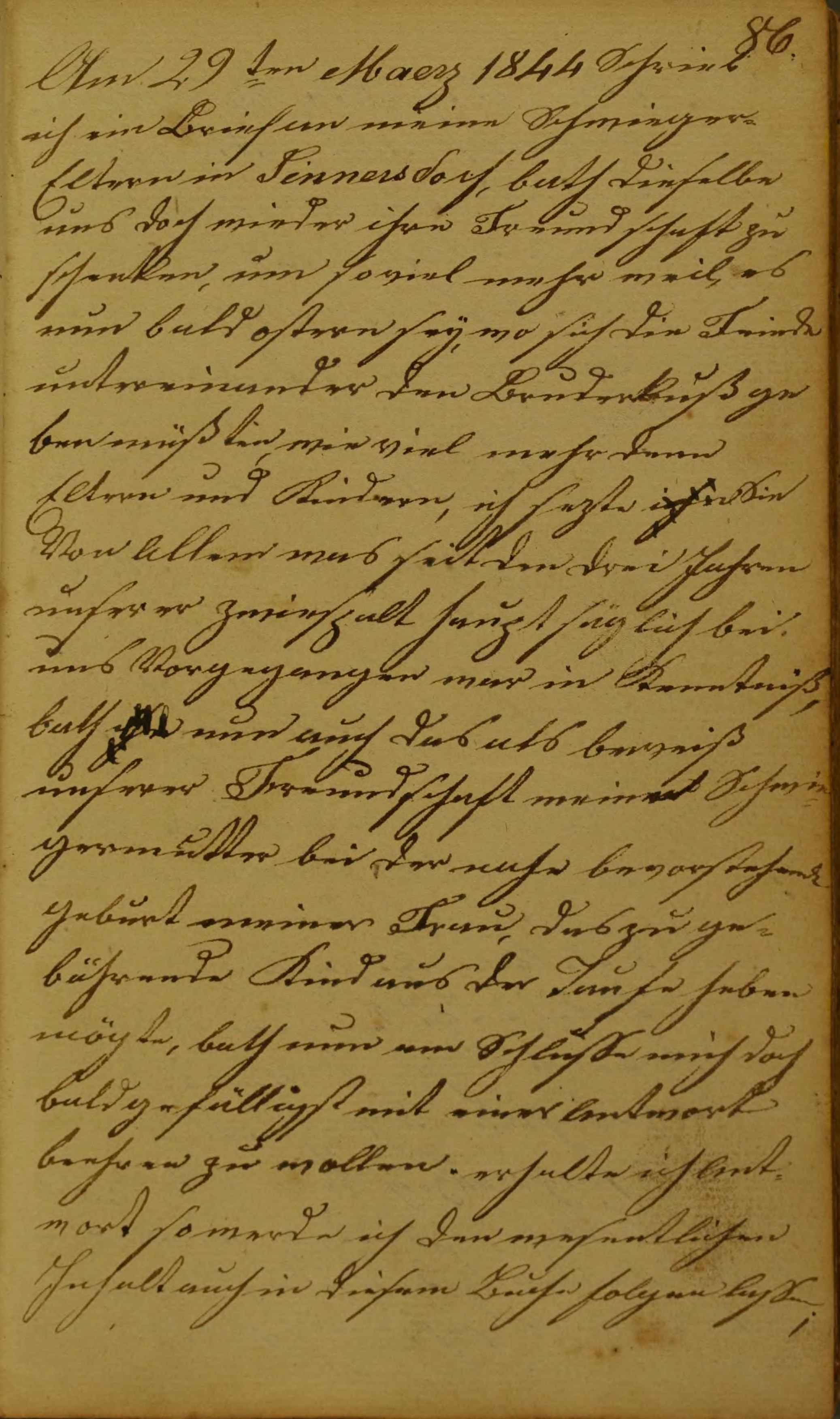 Am 29ten Maerz 1844 Schrieb ich ein Brief an meine Schwieger-Eltern in Sinnersdorf, bath dieselbe uns doch wieder ihre Freundschaft zu schenken, um soviel mehr weil, es nun bald ostern sey, wo sich die Feinde untereinander den Bruderkuß geben müßten, wie viel mehr denn Eltern und Kindern, ich sezte ihn Sie Von Allem was seit den drei Jahren unserer zwiespalt haupt säglich bei uns Vorgegangen war in Kenntniß, bath ihn nun auch das als beweiß unserer Freundschaft meine Schwiegermutter bei der nahe bevorstehende Geburt meiner Frau, das zu gebährende Kind aus der Taufe heben mögte, bath nun am Schlusse mich doch bald gefälligst mit einer Antwort beehren zu wollen. erhalte ich Antwort so werde ich den wesentlichen Inhalt auch in diesem Buche folgen laßen;