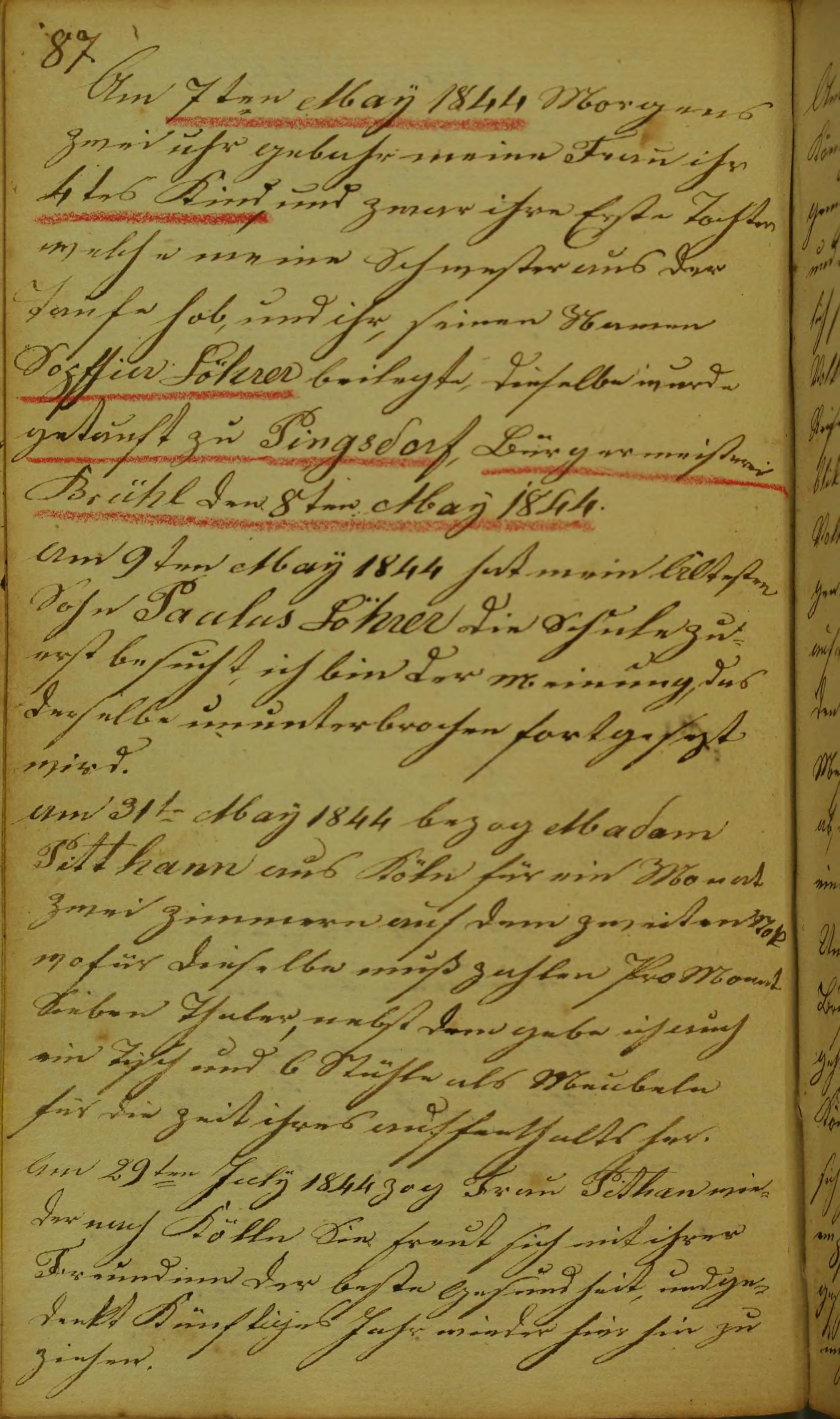 Am 31ten May 1844 bezog Madam Pitthann aus Köln für ein Monat Zwei Zimmern auf dem zweiten Stok wofür dieselbe muß zahlen Pro Monat Sieben Thaler, nebst dem gebe ich auch ein Tisch und 6 Stühle als Meubeln für die zeit ihres auffenthalts her.