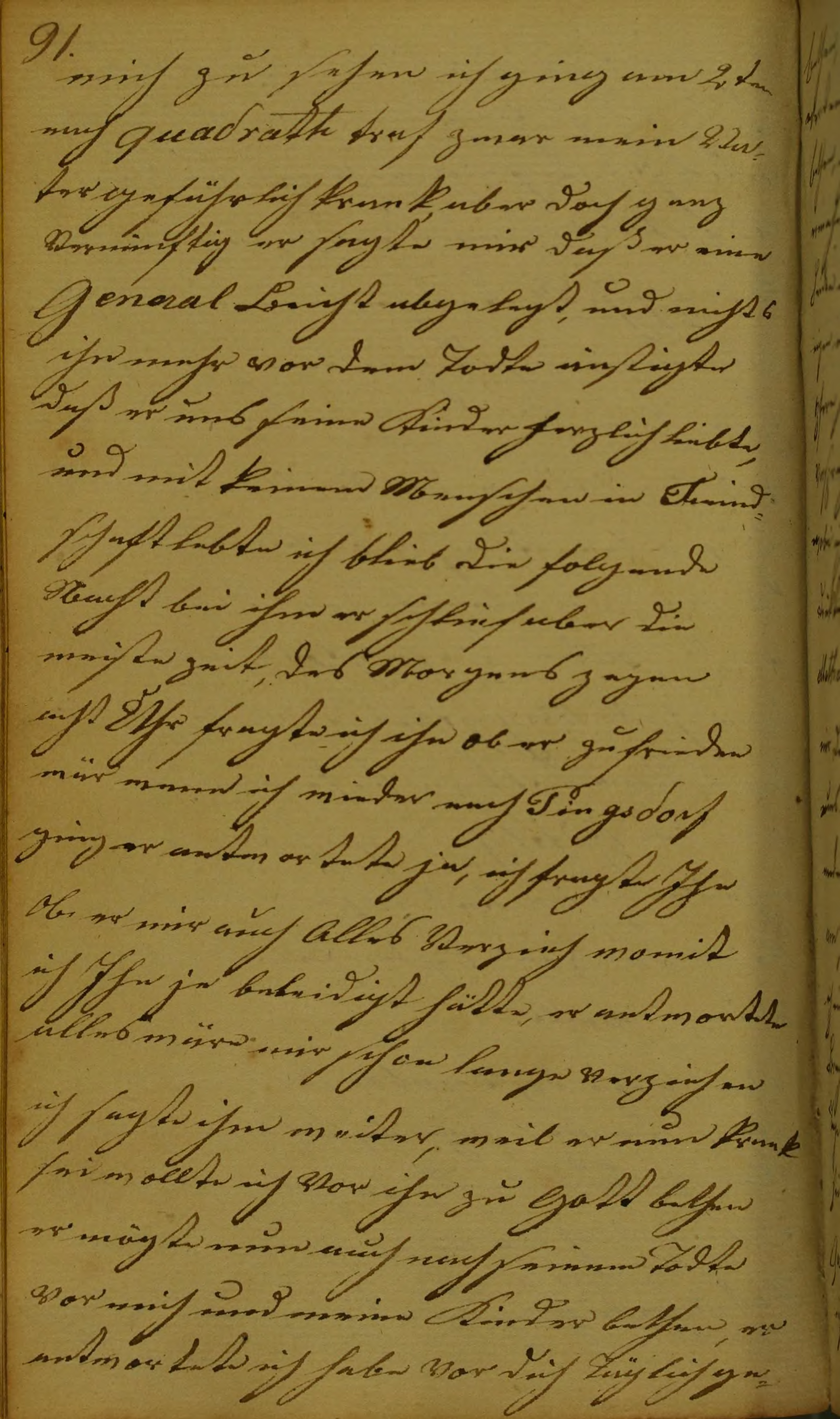 mich zu sehen ich ging am 2ten nach Quadrath traf zwar mein Vater gefährlich krank, aber doch ganz Vernünftig er sagte mir daß er eine General Beicht abgelegt, und nichts ihn mehr vor dem Todte änstigte daß er uns seine Kinder herzlich liebte, und mit keinem Menschen in Feindschaft lebte ich blieb die folgende Nacht bei ihm er schlief aber die meiste zeit, des Morgens gegen acht Uhr fragte ich ihn ob er zufrieden wär wenn ich wieder nach Pingsdorf ging er antwortete ja, ich fragte Ihn ob er mir auch Alles Verzieh womit ich Ihn je beleidigt hätte, er antwortete alles wäre mir schon lange verziehen ich sagte ihm weiter, weil er nun krank sei wollte ich Vor ihn zu Gott bethen er mögte nun auch nach seinem Todte Vor mich und meine Kinder bethen, er antwortete ich habe Vor dich Täglich gebethen,