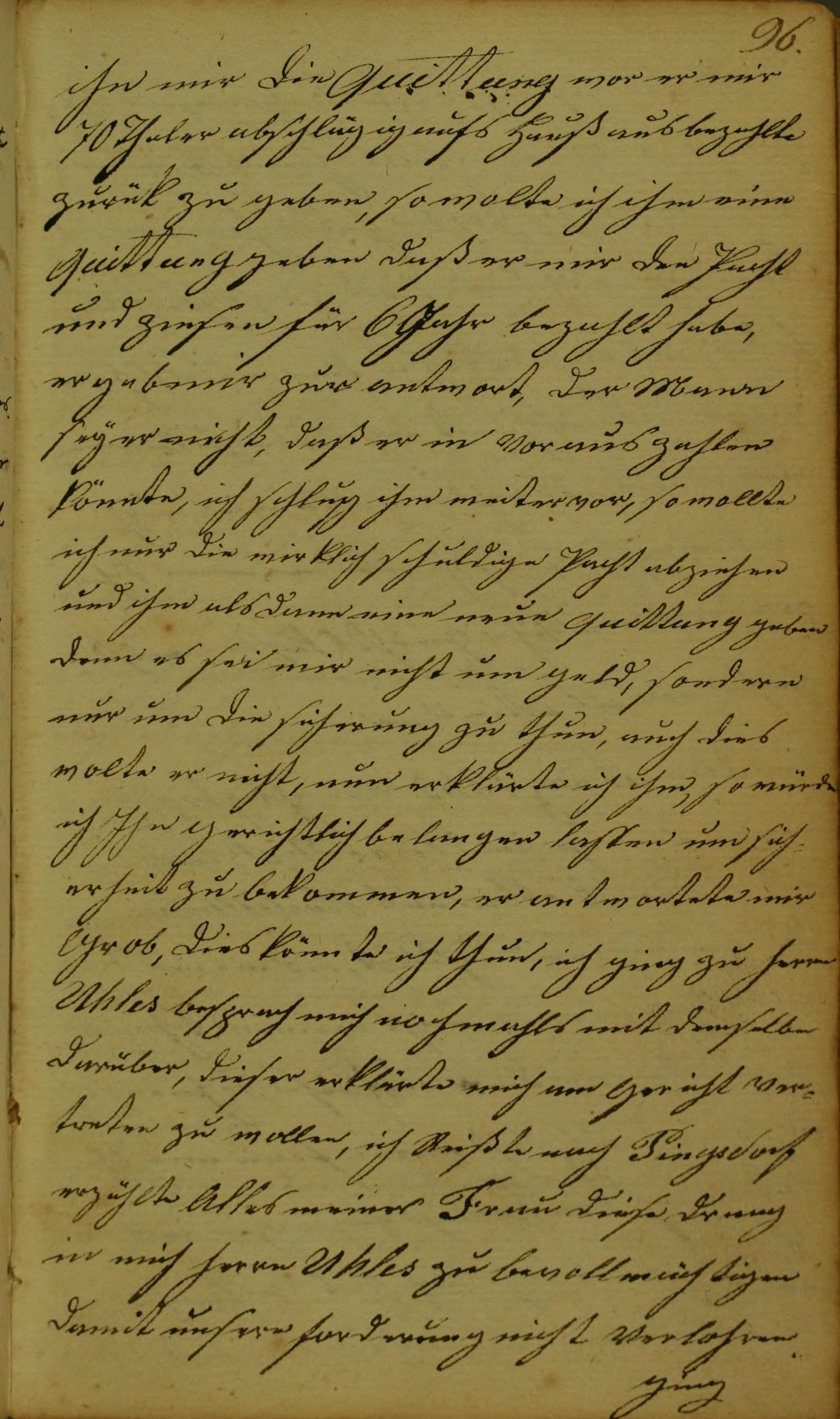 ihn mir die Quittung wor er mir 70 Thaler abschlägig aufs Hauß ausbezahlte zurük zu geben, so wolte ich ihm eine Quittung geben daß er mir den Pacht und Zinsen für 6 Jahr bezahlt habe, er gab mir zur antwort, der Mann sey er nicht, daß er in Voraus zahlen könnte, ich schlug ihm weiter vor, so wollte ich nur die wirklich schuldige Pacht abziehen und ihm als dann eine neue Quittung geben denn es sei mir nicht um Geld, sondern nur um die sicherung zu thun, auch dies wolte er nicht, nun erklärte ich ihm, so würde ich Ihn gerichtlich belangen lassen um sicherheit zu bekommen, er antwortete mir Grob, dies könnte ich thun, ich ging zu herrn Uhles besprach mich nochmahls mit demselben darüber, dieser erklärte mich am Gericht vertreten zu wollen, ich Reißte nach Pingsdorf erzählte Alles meiner Frau diese drang in mich herrn Uhles zu bevollmächtigen damit unsere forderung nicht Verlohren ging