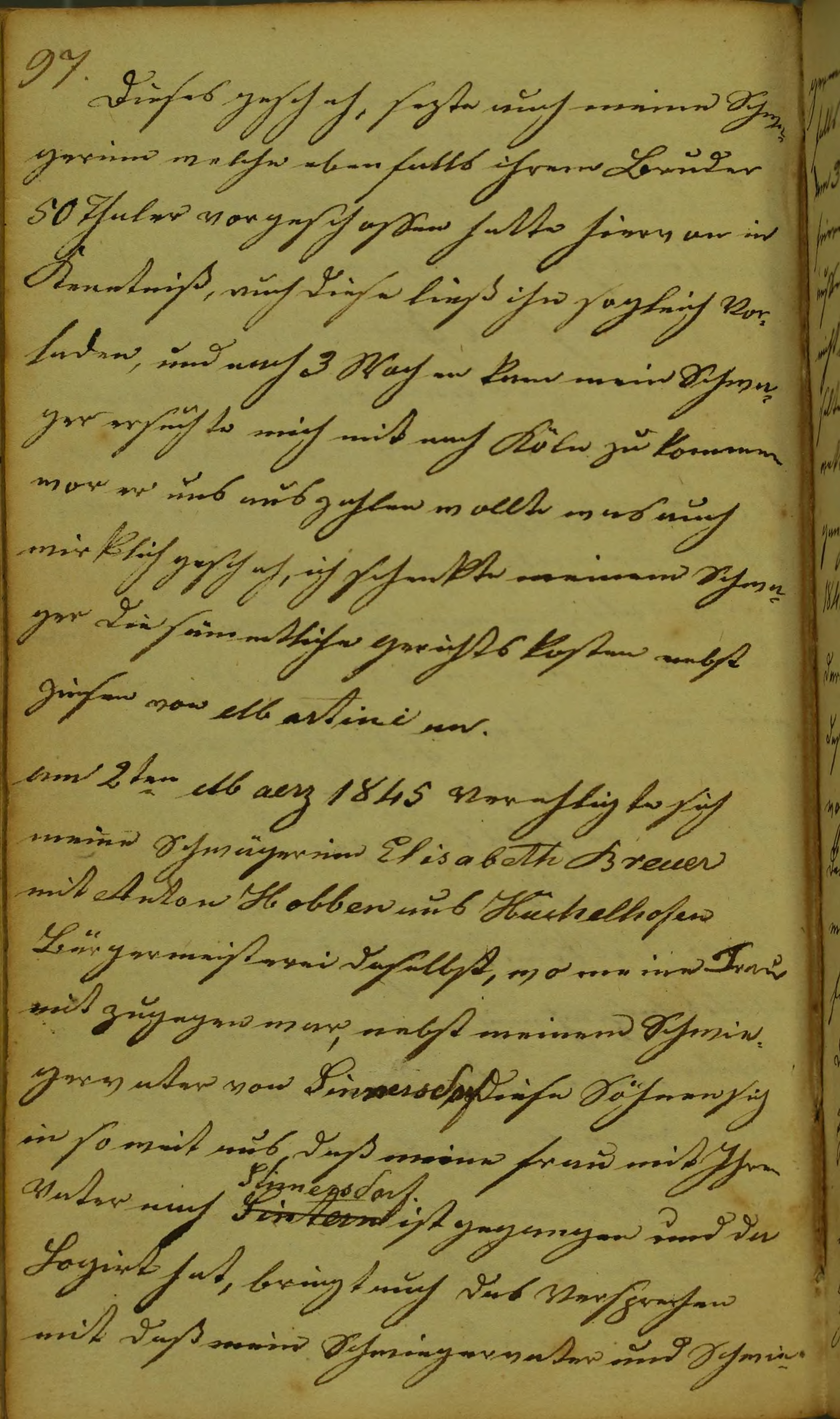 am 2ten Maerz 1845 verehligte sich meine Schwägerinn Elisabeth Breuer mit Anton Hobben aus Hüchelhofen Bürgermeisterei daselbst, wo meine Frau mit zugegen war, nebst meinem Schwiegervater von Sinnersdorf. Diese Söhnen sich in so weit aus, daß meine frau mit Ihrem Vater nach Sintern Sinnersdorf ist gegangen und da Logirt hat, bringt auch das Versprechen mit daß mein Schwiegervater und Schwiegermutter