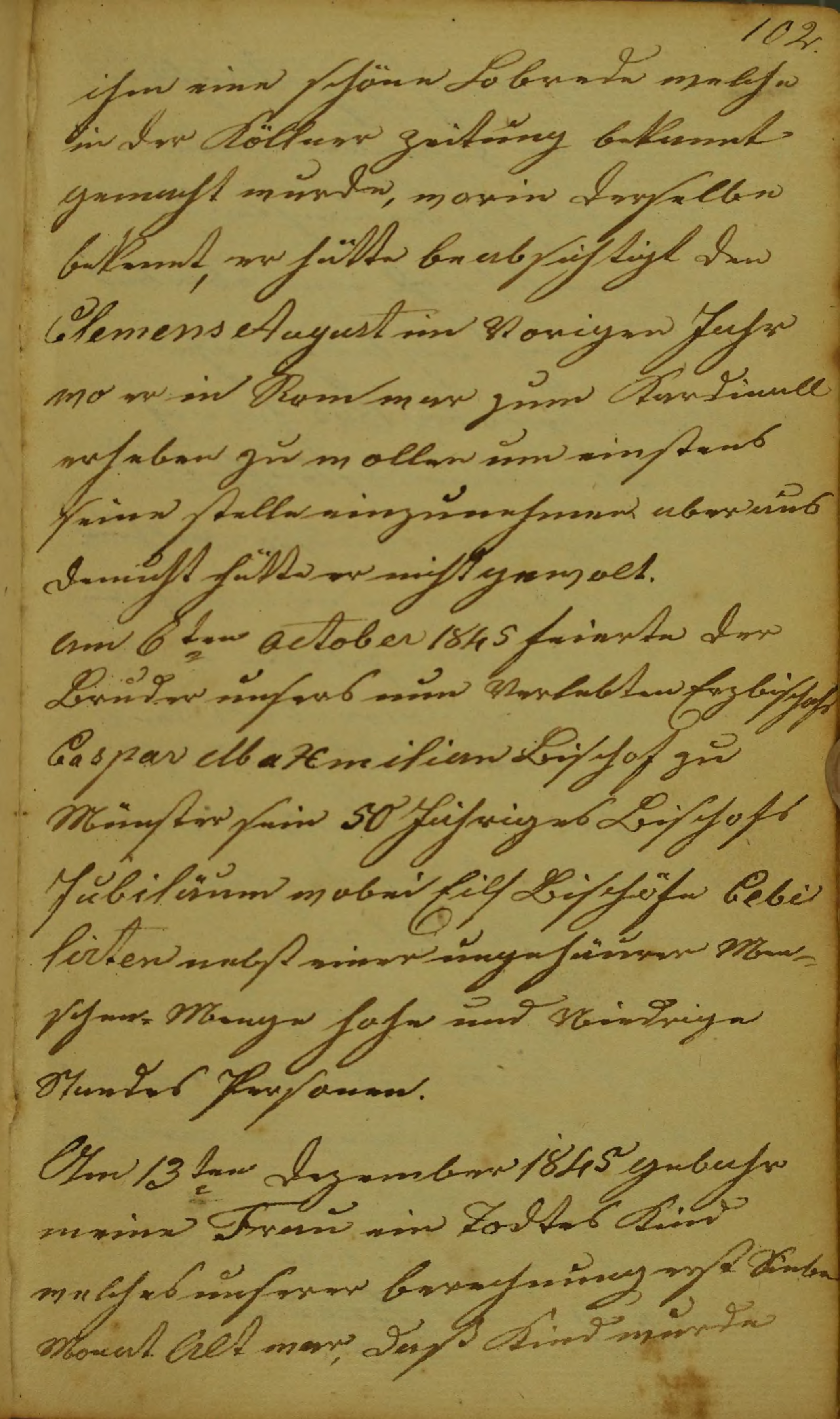 Am 6 ten October 1845 feierte der Bruder unsers nun Verlebten Erzbischofs Caspar Maxmilian Bischof zu Münster sein 50Jähriges Bischofs Jubiläum wobei Eilf Bischöfe Cebilirten nebst einer ungehäurer Menschen-Menge hohe und Niedrige Standes Personen.