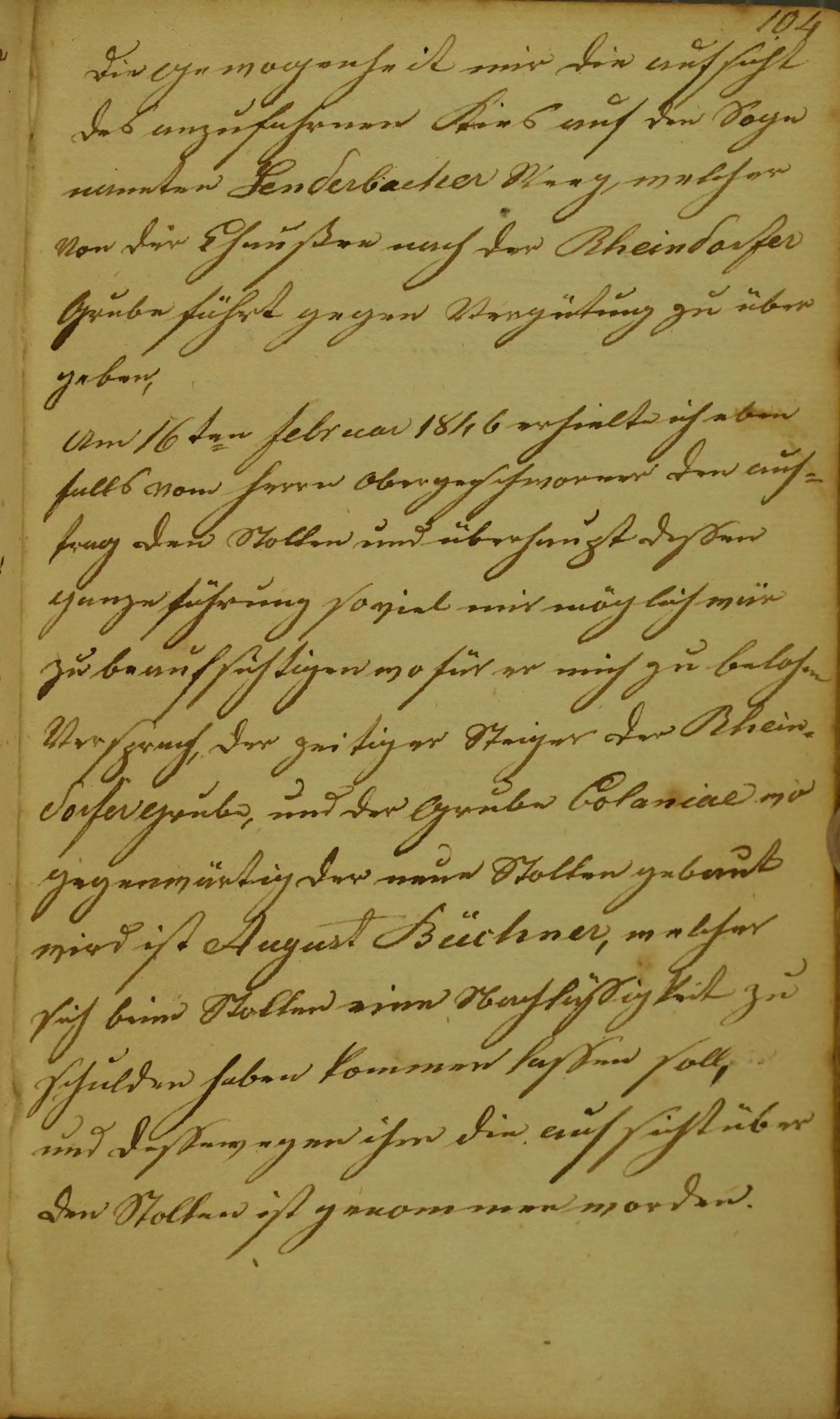 Am 16 ten februar 1846 erhielte ich ebenfalls vom herrn Obergeschworner den auftrag den Stollen und überhaupt dessen ganze führung soviel mir möglich wär zu beaufsichtigen wofür er mich zu belohnen Versprach, der zeitiger Steiger der Rheindorfer Grube, und der Grube Colaniae wo gegenwärtig der neue Stollen gebaut wird ist August Büchner, welcher sich beim Stollen eine Nachlässigkeit zu schulden haben kommen lassen soll, und dessewegen ihm die aufsicht über den Stollen ist genommen worden.