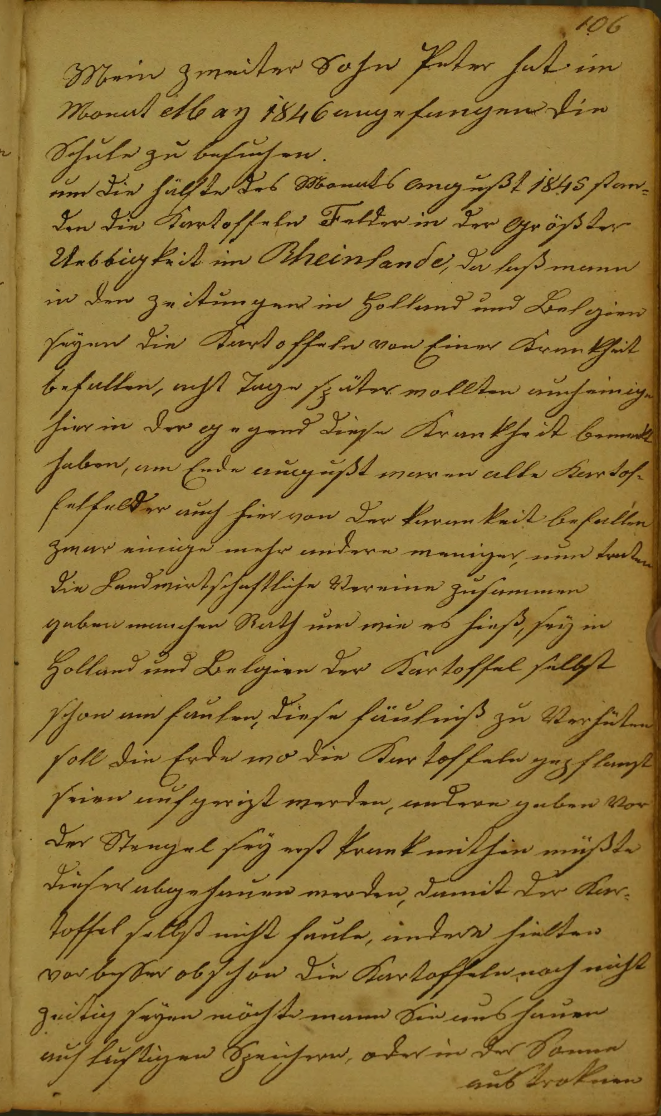 um die hälfte des Monats augußt 1845 standen die Kartoffeln Felder in der Größter Uebbigkeit im Rheinlande, da laß mann in den zeitungen in Holland und Belgien seyen die Kartoffeln von Einer Krankheit befallen, acht Tage später wollten auch einige hier in der gegend diese Krankheit bemerkt haben, am Ende augußt waren alle Kartoffelfelder auch hier von der Krankeit befallen zwar einige mehr andere weniger, nun traten die Landwirtschaftliche Vereine zusammen gaben manchen Rath um wie es hieß, sey in Holland und Belgien der Kartoffel selbst schon am faulen, diese fäulniß zu Verhüten soll die Erde wo die Kartoffeln gepflanzt seien aufgerizt werden, andere gaben Vor der Stengel sey erst krank mithin müßte dieser abgehauen werden, damit der Kartoffel selbst nicht faule, andere hielten vor besser obschon die Kartoffeln noch nicht zeitig seyen möchte mann Sie aushauen auf luftigen Speichern, oder in der Sonne austroknen