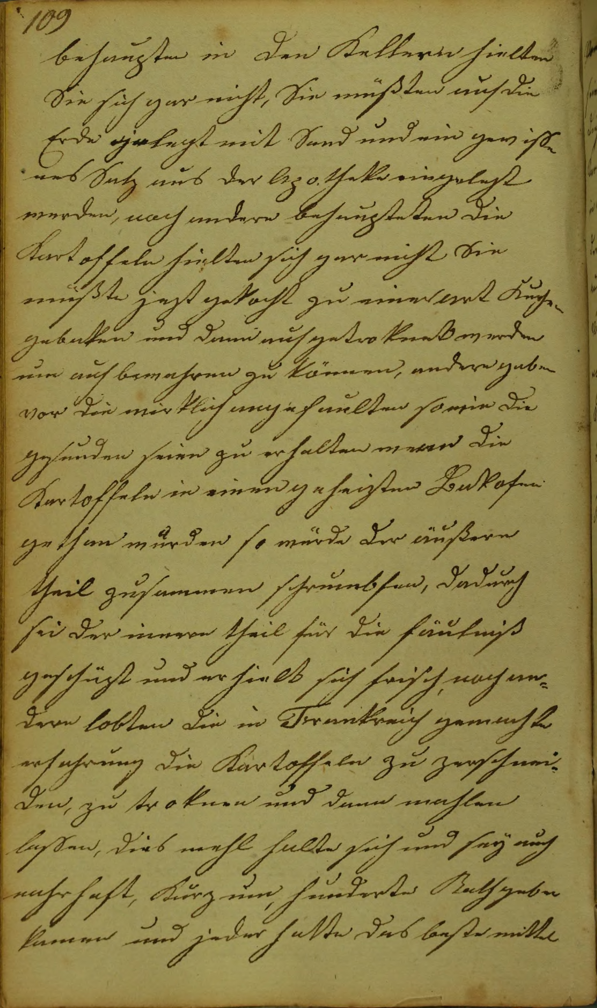behaupten in den Kellern hielten Sie sich gar nicht, Sie müßten auf die Erde gelegt mit Sand und ein gewissenes Salz aus der Apotheke eingelegt werden, noch andere behaupteten die Kartoffeln hielten sich gar nicht Sie müßte jetzt gekocht zu einer art Kuchen gebaken und dann aufgetroknet werden um aufbewahren zu können, andere gaben vor die wirklich angefaulten so wie die gesunden seien zu erhalten wenn die Kartoffeln in einen geheizten Bakofen gethan würden so würde der äußern theil zusammen schrumbfen, dadurch sei der innere theil für die fäulniß geschüzt und erhielt sich frisch, noch andere lobten die in Frankreich gemachte erfahrung die Kartoffeln zu zerschneiden, zu troknen und dann mahlen lassen, dies mehl halte sich und sey auch nahrhaft, Kurzum, hunderte Rathgeber kamen und jeder hatte das beste mittel