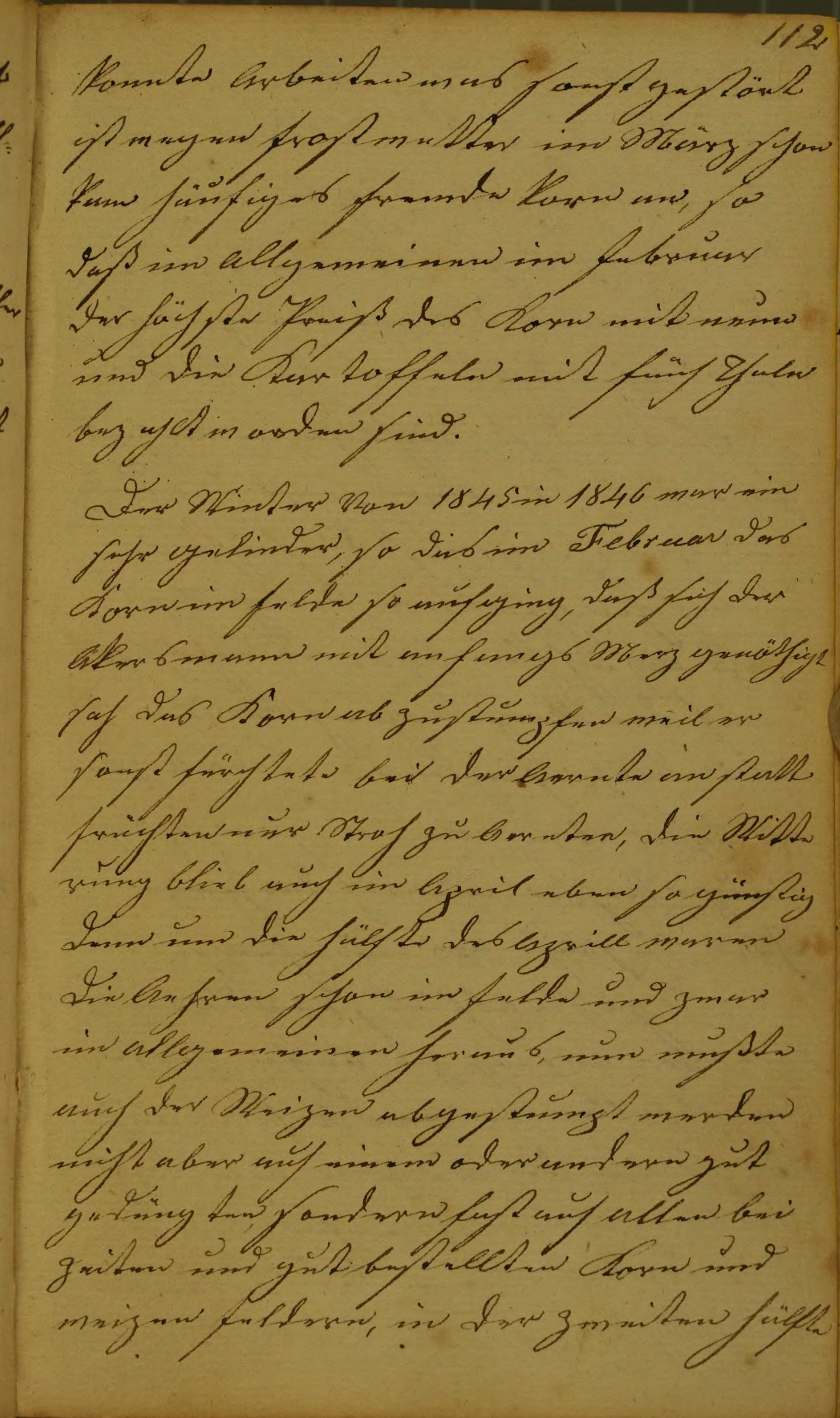 Der Winter Von 1845 in 1846 war ein sehr gelinder, so das im Februar das Korn im felde so aufging, daß sich der Akersmann mit anfangs Merz genöthigt sah das Korn abzustumpfen weil er sonst fürchtete bei der Aernte anstatt früchten nur Stroh zu aernten, die Witterung blieb auch im April eben so günstig denn um die hälfte des Aprill waren die Aehren schon im felde und zwar im allgemeinen heraus, nun mußte auch der Weizen abgestumpt werden nicht aber auf einem oder andern gut gedüngten, sondern fast auf allen bei zeiten und gut bestellten Korn und weizen feldern, in der zweiten hälfte