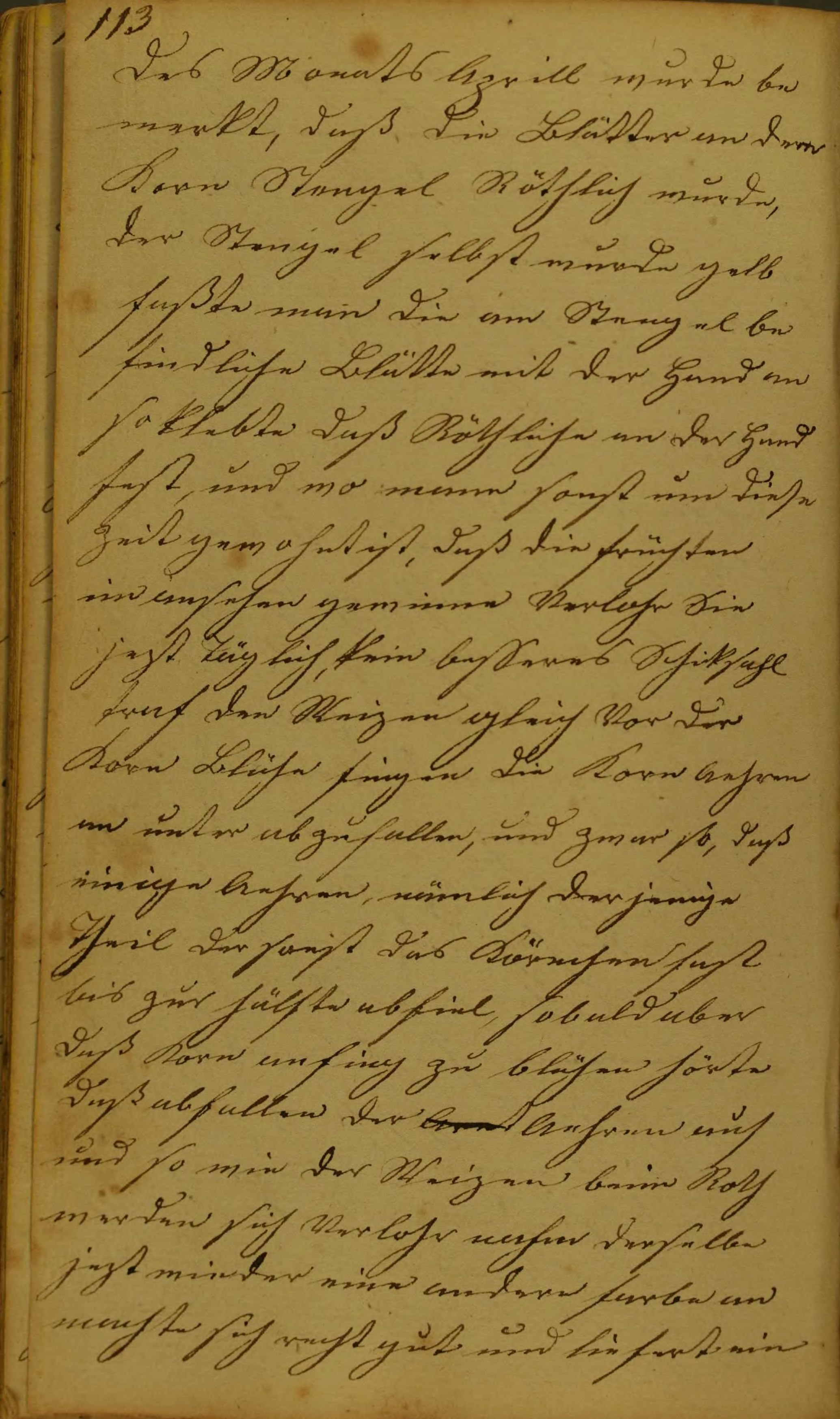 des Monats Aprill wurde bemerkt, daß die Blätter an dem Korn Stengel Röthlich wurde, der Stengel selbst wurde gelb faßte man die am Stengel befindliche Blätte mit der Hand an so klebte daß Röthliche an der Hand fest, und wo mann sonst um diese Zeit gewohnt ist, daß die früchten im ansehen gewinne Verlohr Sie jezt Täglich, kein besseres Schiksahl traf den Weizen gleich Vor der Korn Blühe fingen die Korn Aehren an unter abzufallen, und zwar so, daß einige Aehren nämlich derjenige Theil der sonst das Körnchen fast bis zur hälfte abfiel, sobald aber daß Korn anfing zu blühen hörte daß abfallen der Arent Aehren auf und so wie der Weizen beim Roth werden sich Verlohr nahm derselbe jezt wieder eine andere farbe an machte sich recht gut und liefert ein