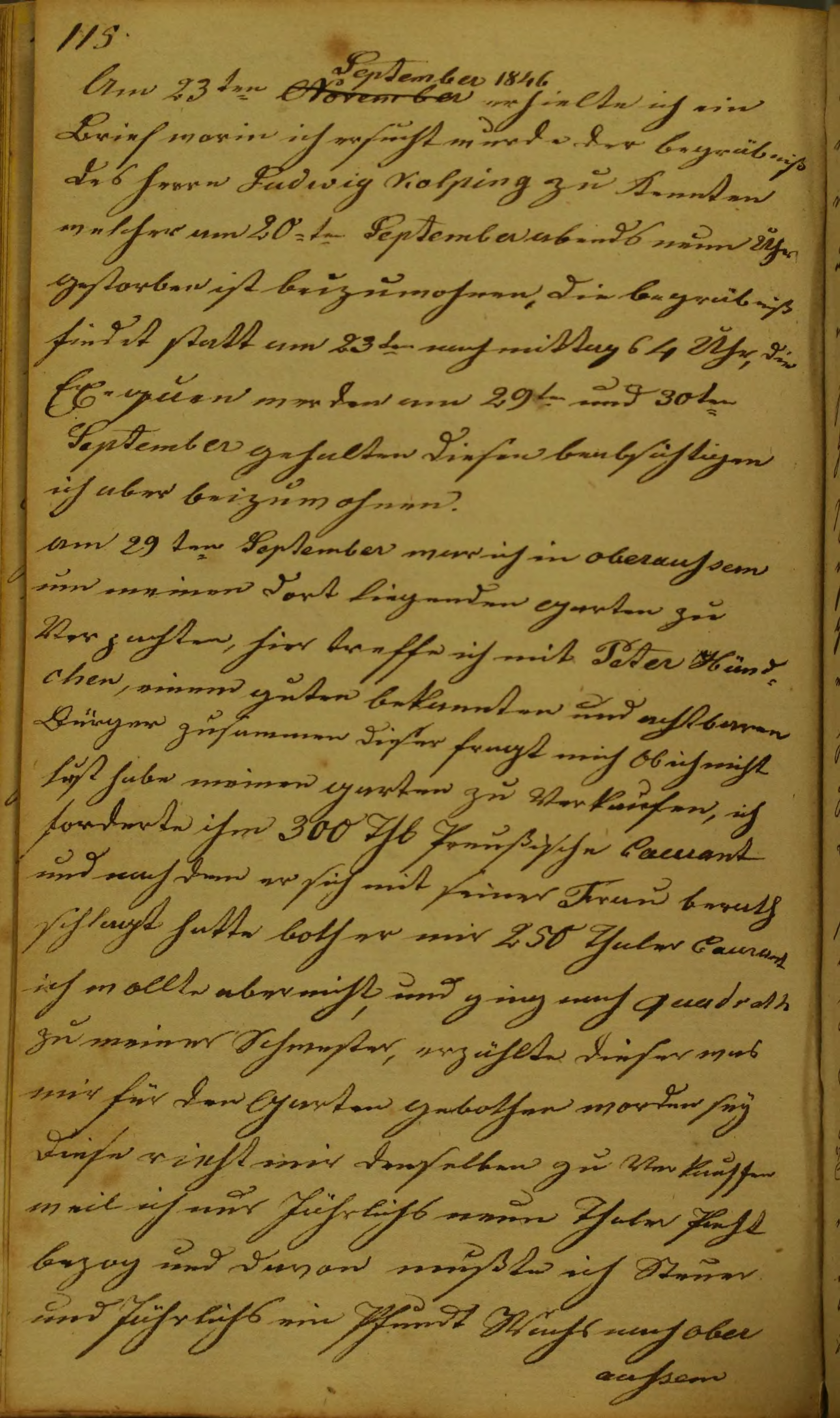 Am 29ten September war ich in oberaussem um meinen dort liegenden Garten zu Verpachten, hier treffe ich mit Peter Hündchen, einem guten bekannten und achtbaren Bürger zusammen dieser fragt mich ob ich nicht lust habe meinen Garten zu Verkaufen, ich forderte ihm 300 Thl Preußische Caurant und nachdem er sich mit seiner Frau berathschlagt hatte both er mir 250 Thaler Caurant ich wollte aber nicht, und ging nach Quadrath zu meiner Schwester, erzählte dieser was mir für den Garten gebothen worden sey diese rieht mir denselben zu Verkauffen weil ich nur Jährlichs neun Thaler Pacht bezog und davon mußte ich Steuer und Jährlichs ein Pfundt wachs nach oberaussem